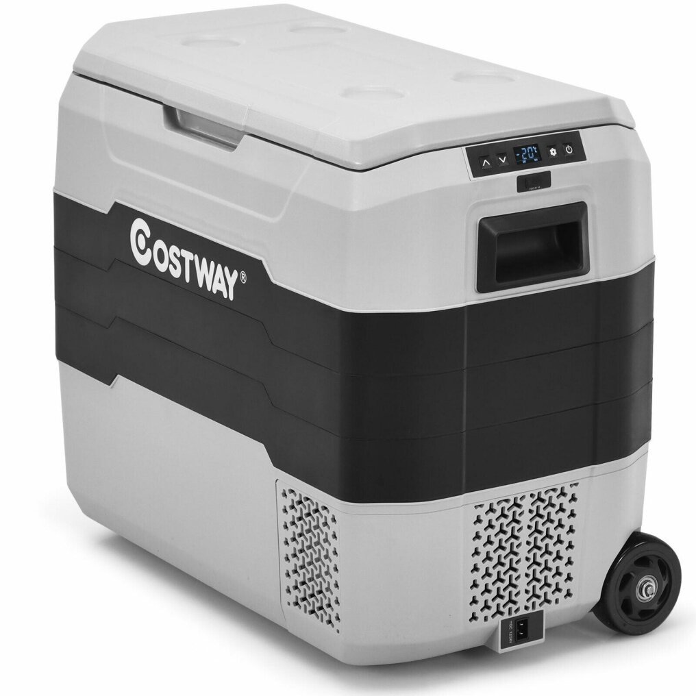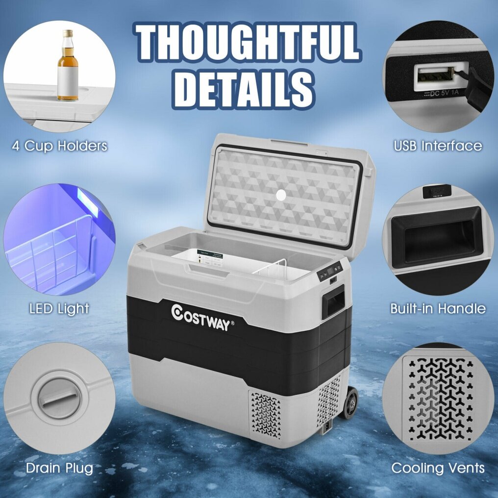 • ● 53 Qt Large Capacity & Dual Zone: This 53-quart car fridge is divided into 2 areas by a movable partition, providing large refrigeration and deep-freezing space for different items, such as animal corpses, mystery meats, skincare products, or medication. Besides, with 4 cup holders, you will no longer worry about where to place your beverages.