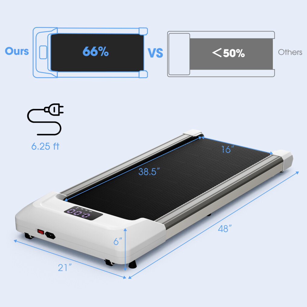 ● Easy Move and Storage: Equipped with 2 built-in wheels, the walking treadmill is simple to move after being lifted. Moreover, the 6” thickness makes it perfect to be stored under the bed or sofa, saving much valuable space.