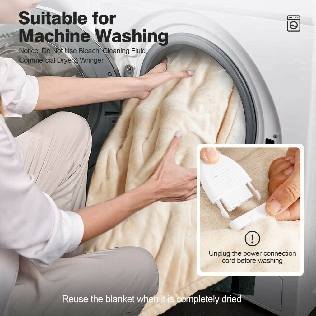 This blanket has a thermostatic controller for you to adjust the temperature from 72 to 122 ℉in 5 different setting levels. So you can humanize the heating temperature as needed. Moreover, this blanket has a function of auto shut off after the heating system is turned on for 3 hours. This is designed for increased security while cutting your electricity bill. This specially designed warming blanket is made of flannel and Sherpa, offering you a comfortable and soft touch. Besides, this blanket is machine washable. Just remove the controller and cord, then put the blanket into the washing machine for cleaning. All in all, this blanket is easy to use and take care you in cold days.