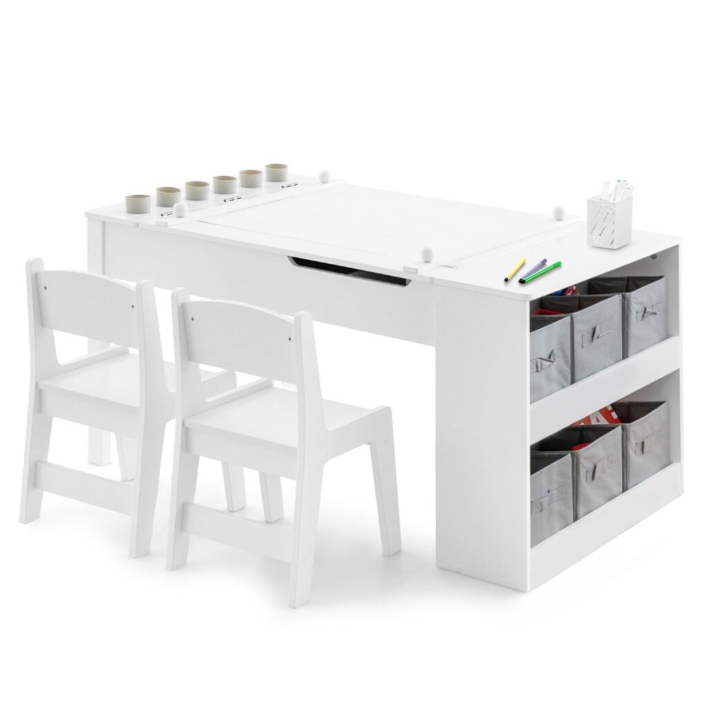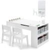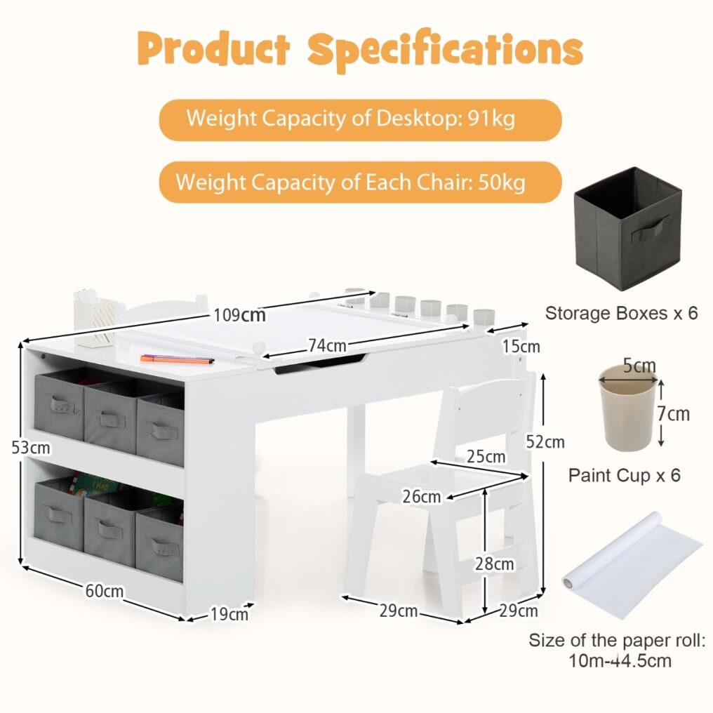 The white desk and chairs set is the perfect addition to any young artist's space. This well-crafted set comes complete with 2 chairs, 6 canvas baskets, 4 paint cups, and a roll of paper. Your child can use the table for colouring, kinetic sand, snack time, etc. The chair ensures optimal ergonomic support. Storage space under the table offers convenient storage for all kinds of supplies, keeping your child’s creative process uninterrupted. With durable materials, this art desk and chair set is built to last, surviving daily wear and tear with ease. In addition, quick assembly is possible with just a few simple steps, making setup a breeze. This versatile art desk and chair set prove ideal for home use, school projects, or classes, offering a functional and stylish solution that encourages creativity in children.