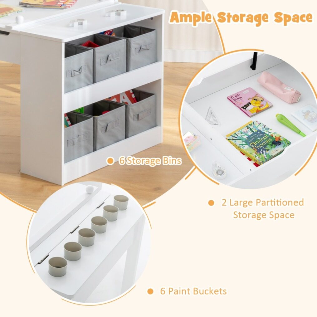Convenient Storage: The art desk and chair set includes 6 canvas baskets and 4 paint cups, providing perfect storage for pens, pencils, markers, brushes, and other supplies. There are also 2 partitions of storage space under the table for children's paintings and other books.