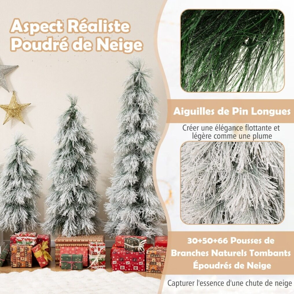 This realistic set of three Christmas trees is the perfect trio for festive decorations. Thanks to their varying heights, the three trees offer great flexibility in arranging your Christmas decorations. You can group them together or scatter them around the room to create a festive atmosphere. Each tree is adorned with long pine needles for a soft, airy look. Furthermore, the 30, 50, and 66 snow-covered branches evoke freshly fallen snow. Warm white LEDs emit a soft glow that enhances the holiday ambiance.