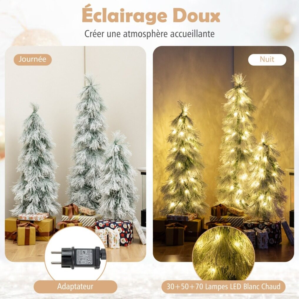 【Soft Lighting】The three snow-covered Christmas trees are equipped with 30, 50, and 70 warm white LEDs, creating a cozy and inviting atmosphere. Powered by an adapter, the lights provide safe and enchanting illumination, perfect for the holiday spirit.