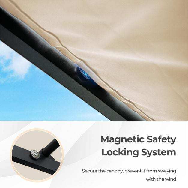 Retractable Canopy: The outdoor pergola is equipped with a retractable canopy, which could meet different needs of full shade, partial sunlight, or open sky views. And there is a convenient rope loop for easy adjustment. When fully opened, the canopy can be secured by the rope loop and a magnetic safety locking system, preventing the canopy from swaying during windy conditions.