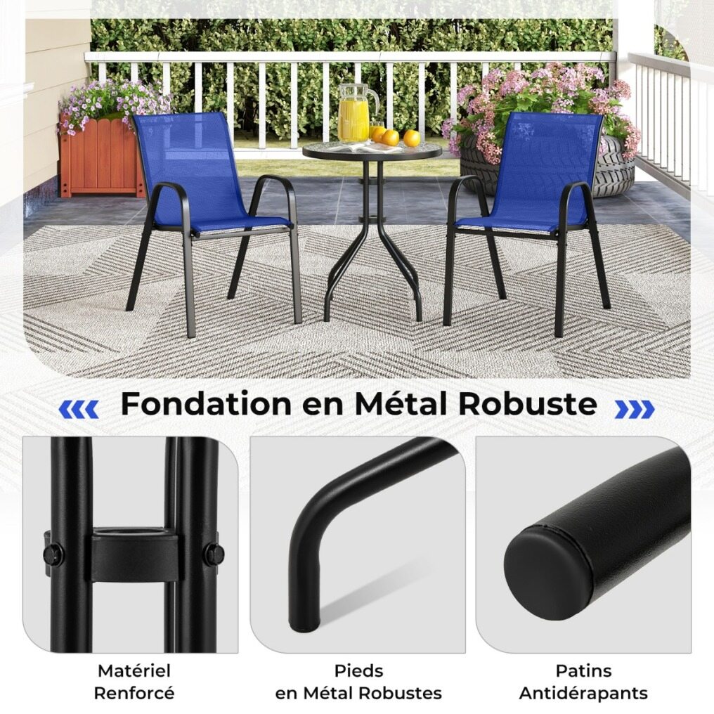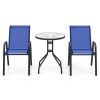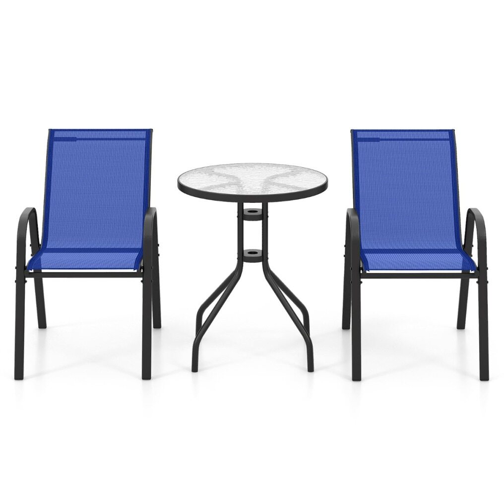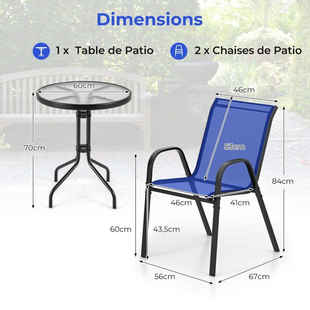 Enjoy comfortable seating with the patio bistro set, featuring ergonomic backrests and breathable, quick-drying, and skin-friendly fabric. The sturdy metal frames and sleek tempered glass top offer durability and ease of maintenance. This conversation furniture set includes stackable chairs for compact storage and can hold up to 150 kg per chair and 50 kg on the table. Perfect for outdoor spaces like gardens, balconies, or poolsides, this versatile bistro set is easy to assemble with clear instructions.
