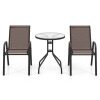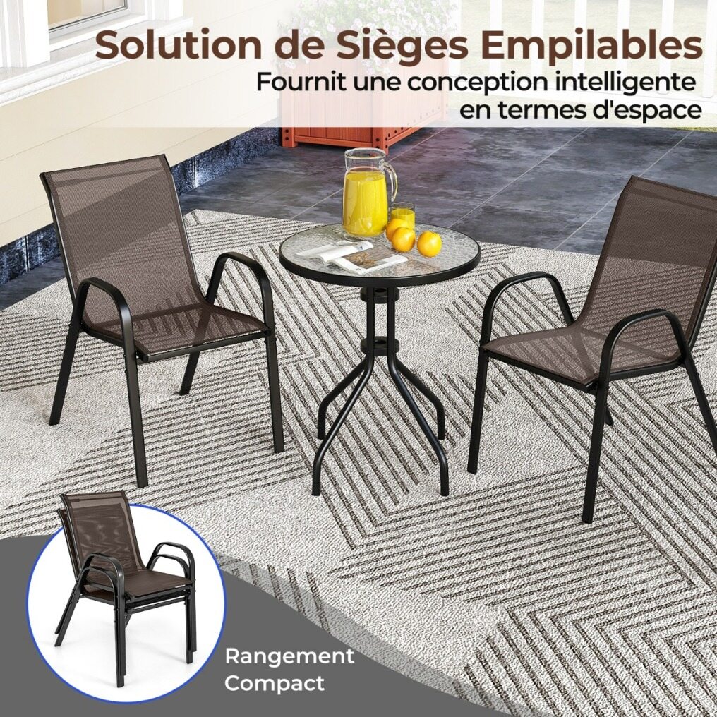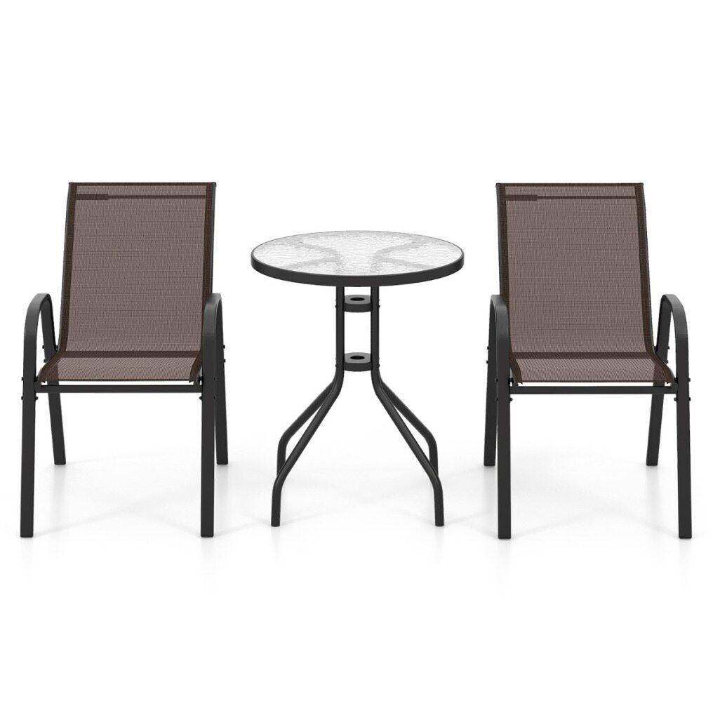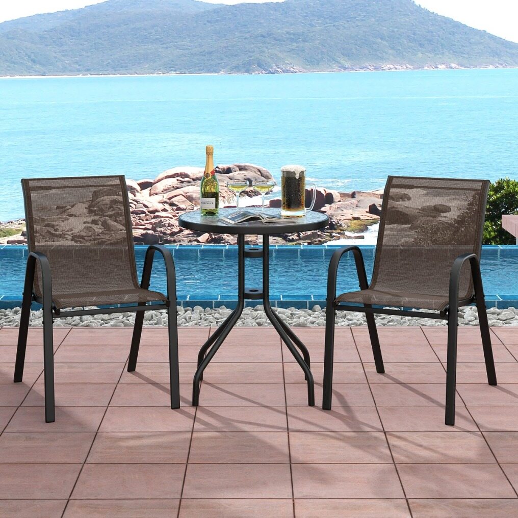 Enjoy comfortable seating with the patio bistro set, featuring ergonomic backrests and breathable, quick-drying, and skin-friendly fabric. The sturdy metal frames and sleek tempered glass top offer durability and ease of maintenance. This conversation furniture set includes stackable chairs for compact storage and can hold up to 150 kg per chair and 50 kg on the table. Perfect for outdoor spaces like gardens, balconies, or poolsides, this versatile bistro set is easy to assemble with clear instructions.