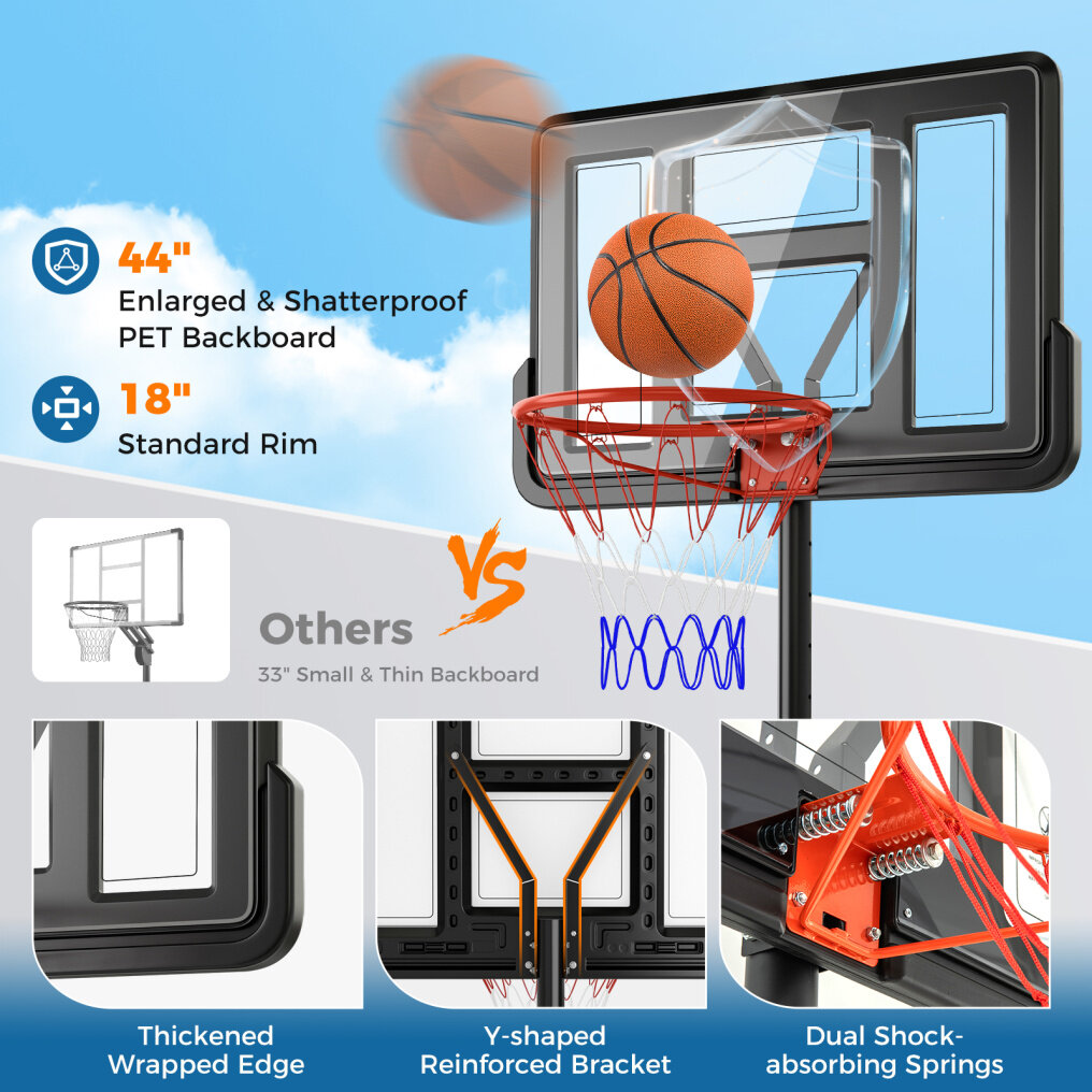 ● 44 Inch Shatterproof Backboard: This basketball goal system is equipped with a 44" enlarged and shatterproof PET backboard. Together with thickened wrapped edge, a Y-shaped reinforced bracket and dual shock-absorbing springs, the backboard ensures a reliable rebound and withstands the intensity of aggressive play.