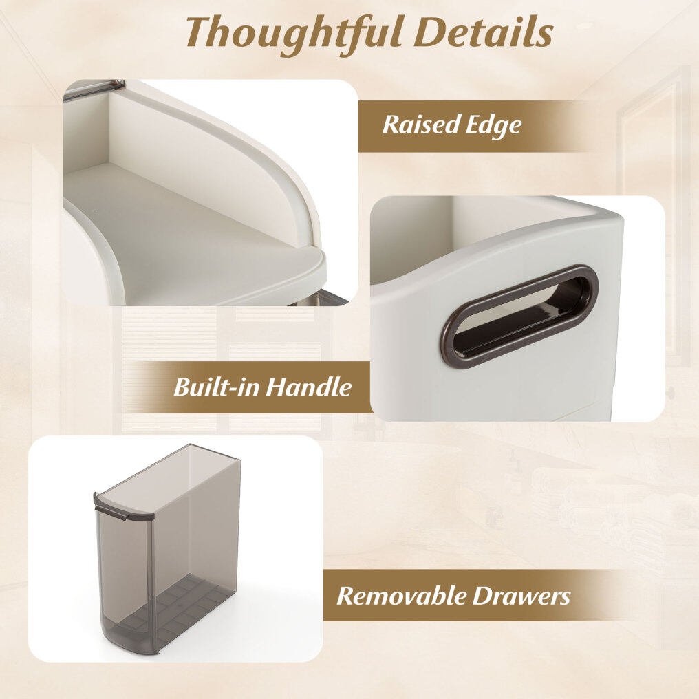 ● Sufficient Categorized Storage: This bathroom cabinet features a flip-top lid, double tissue outlets and see-through drawers of different sizes, ideal for organizing various items, such as cosmetics, toothpaste, tissues, towels, shampoo and laundry detergent.