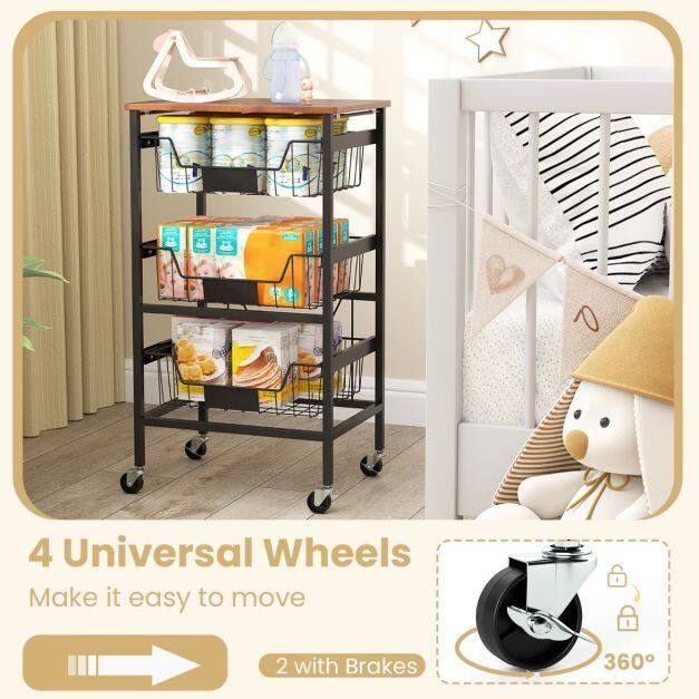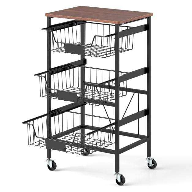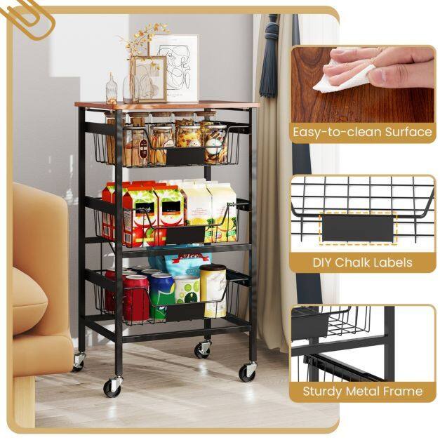 Large Storage Capacity: The kitchen cart features a wooden top so you can easily reach your frequently used items. With 3 convenient pull-out baskets, this rolling snack cart offers more storage options, with each basket being easy to remove when needed.