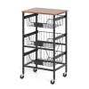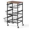 This mobile utility cart offers a perfect storage solution thanks to its wooden top and 3 pull-out baskets. Each basket is removable for added convenience and all come with chalk labels to help you easily categorize different items such as spices, books, fruits and vegetables. The smooth-rolling universal wheels allow for easy mobility, with 2 wheels having brakes for stability when needed. This fruit and vegetable cart with its sturdy metal frame is built to last. But it's not just for the kitchen - it's also ideal for your pantry, living room and bedroom.