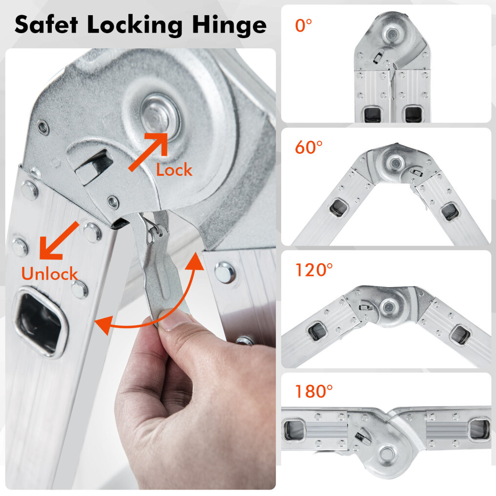 Smooth Adjustability: Thanks to the large size secure locking hinge, the ladder sections can be easily adjusted to different angles from 0° to 180°, allowing quick transitions and angle configurations for each specific task.