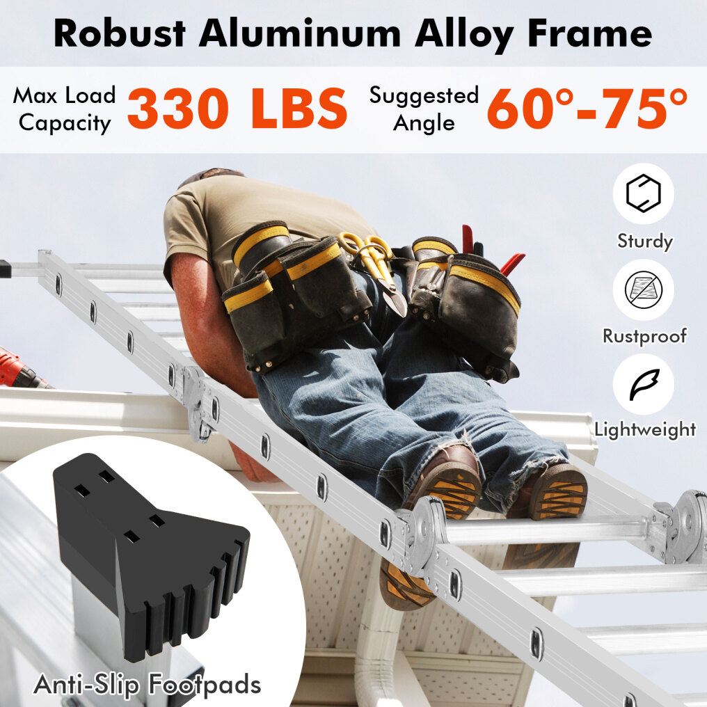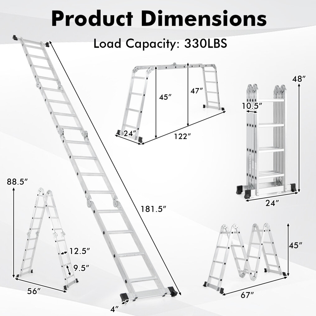 7-in-1 Configuration: This multi-purpose ladder can be converted between 7 configurations, including A-frame, scaffold, stair platform, straight ladder, overhang ladder, step ladder or M-shaped ladder, which can solve different problems in daily life.