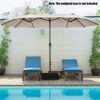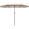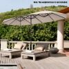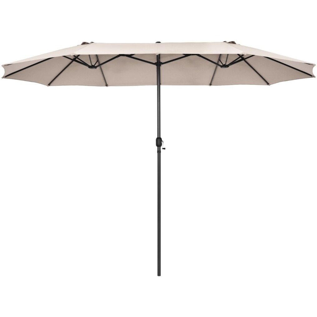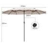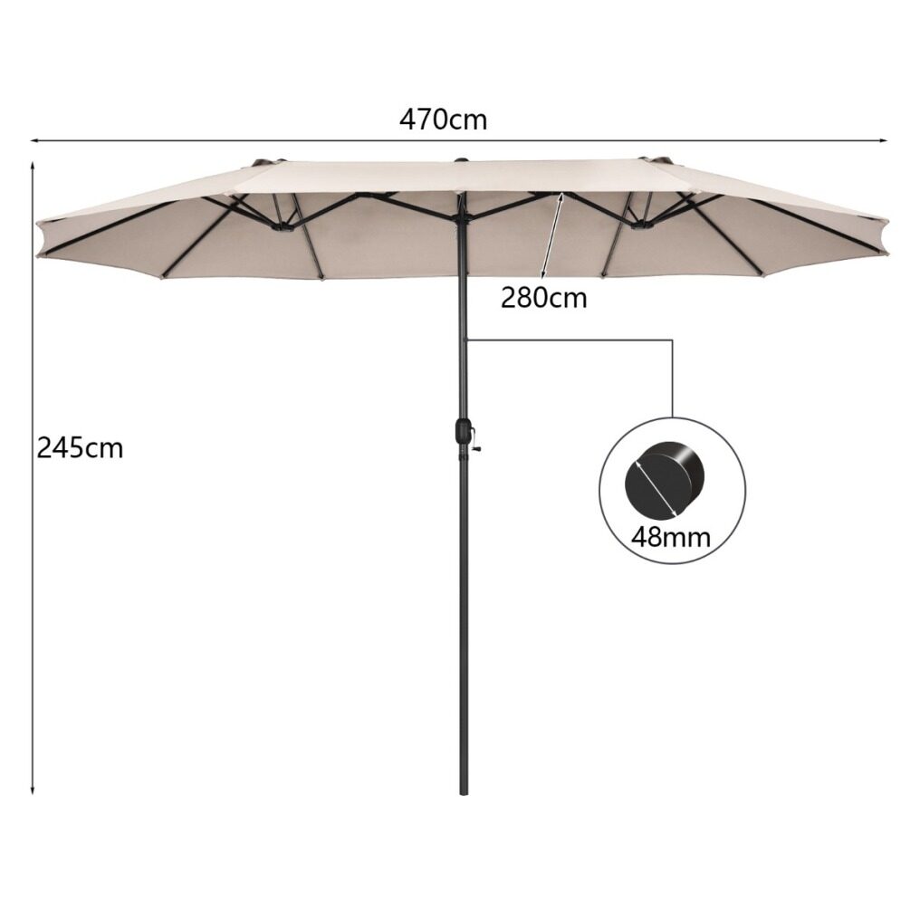Are you looking for a patio umbrella that will provide you with a shady and comfortable relaxation place? The double-sided patio umbrella is an ideal choice. Crafted with 12 sturdy ribs and thick metal pole, the twin outdoor umbrella showcases firmness and durability. In addition, the market umbrella with double-sided canopy blocks up extra sunlight and creates large shady space. Equipped with convenient hand crank, you can open and close the umbrella smoothly. If the umbrella is not in use, do not forget to tie the fixation strap for longer using life. Following the detailed instruction, you can assemble the umbrella in a few minutes. What's more, the market umbrella perfectly matches with different places, bringing cozy and shady space. (Note: A weighted base (sold separately) is needed for better stability)