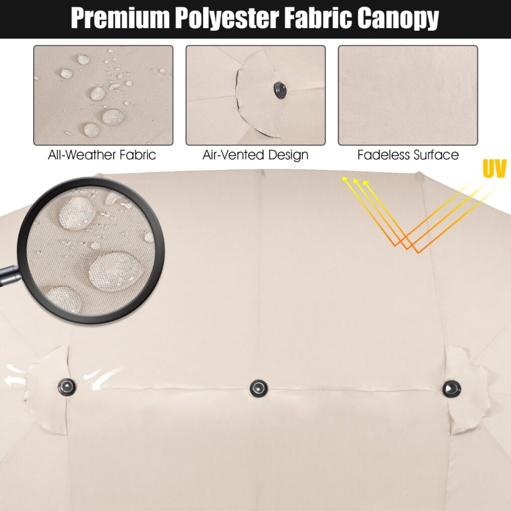 Double-Sided Canopy with Large Shade: The twin patio umbrella provides you and a set of outdoor furniture with sufficient coverage space, bringing shady feel to sultry afternoon. Besides, there are three air-vented holes on the top to promote the circulation for breeze creation.