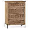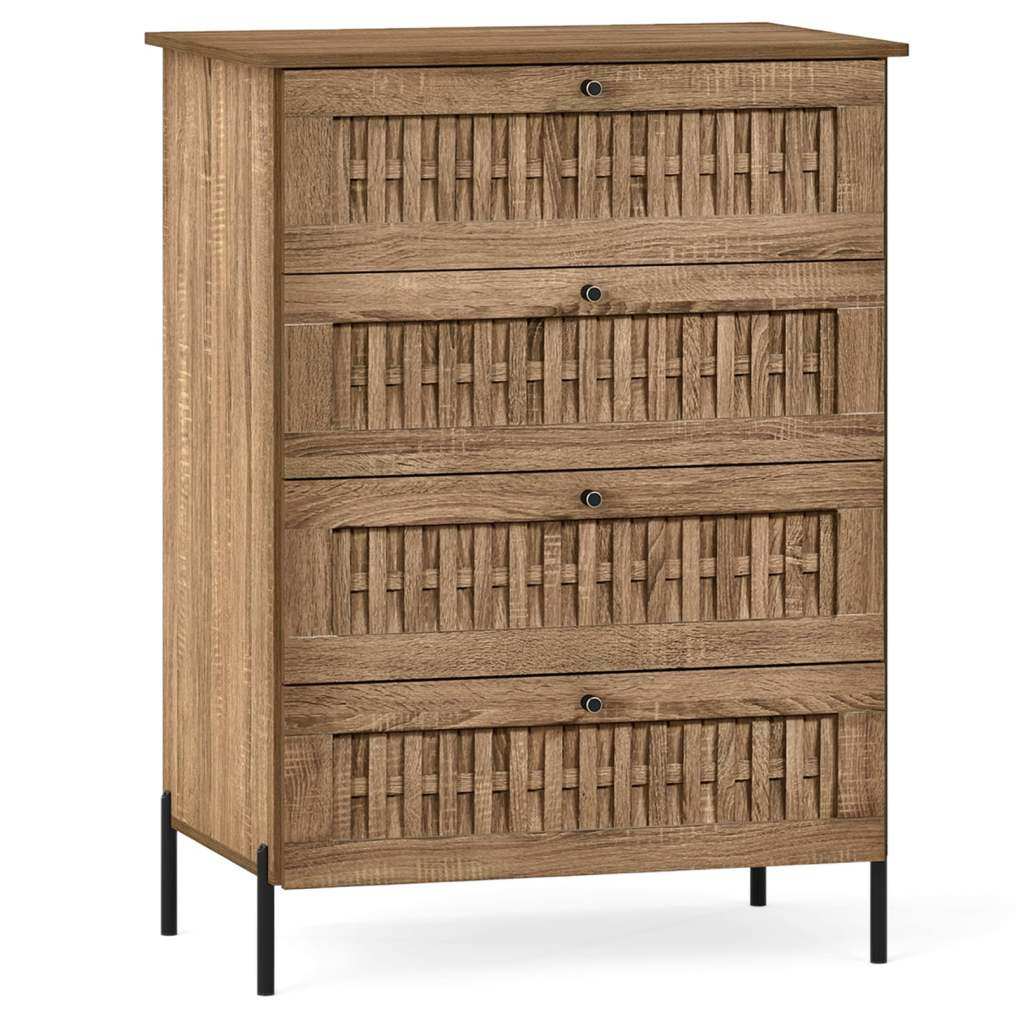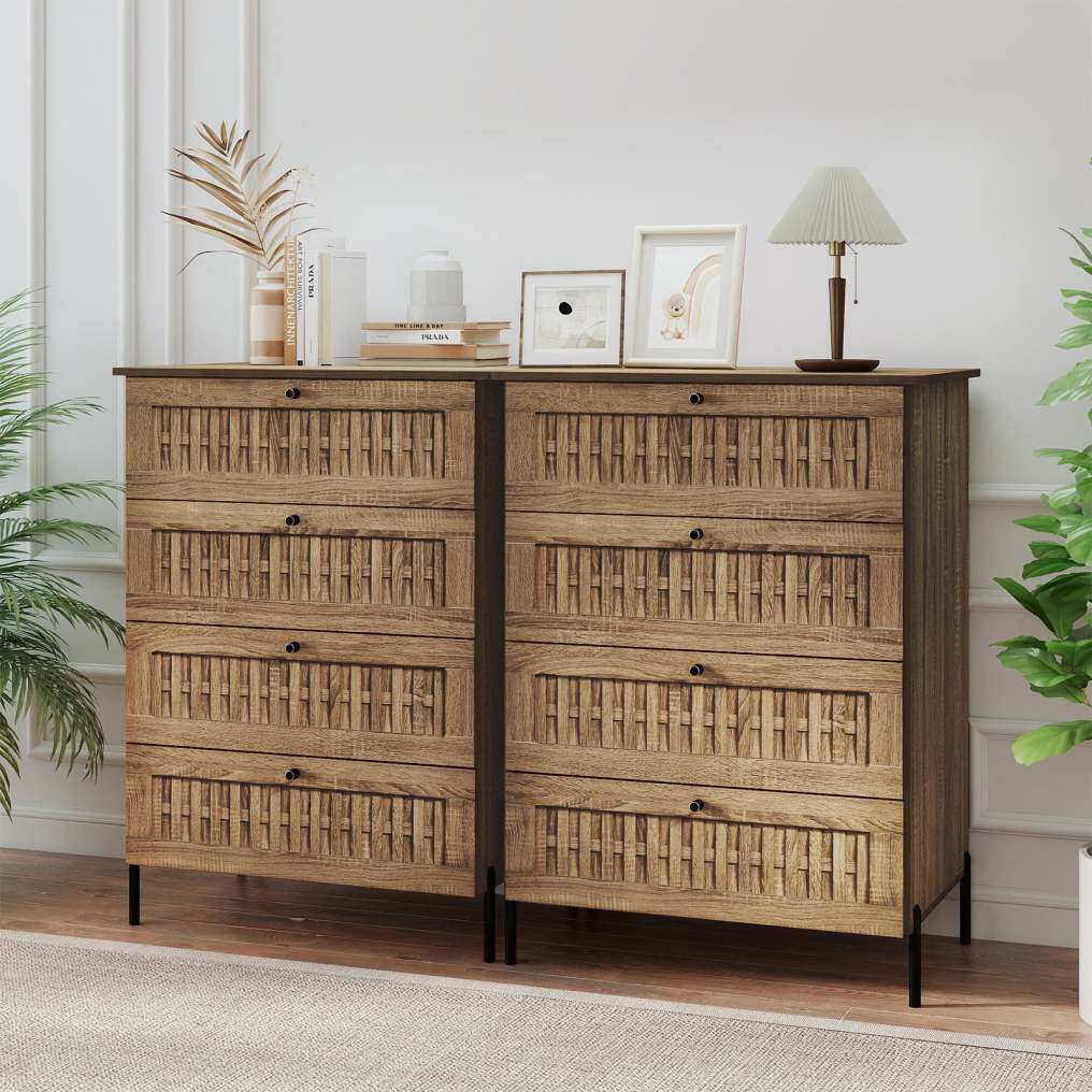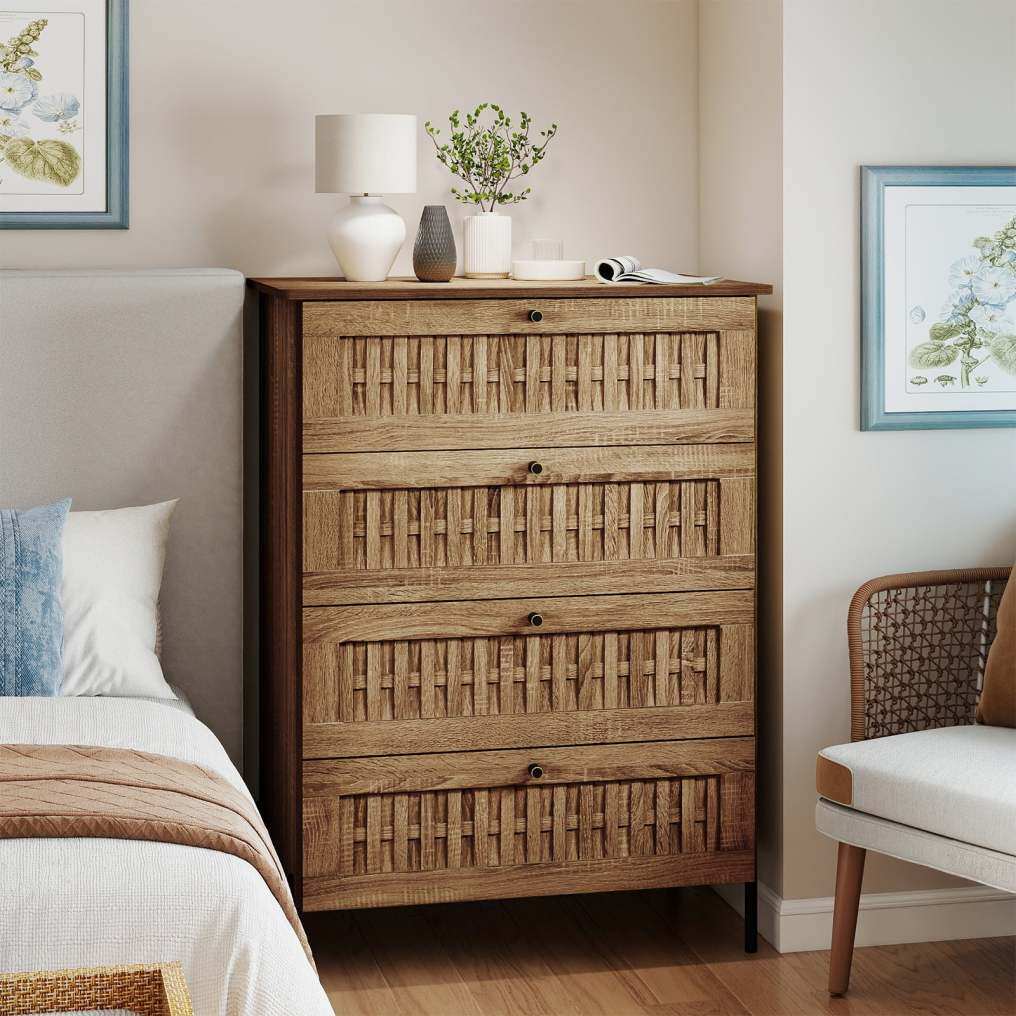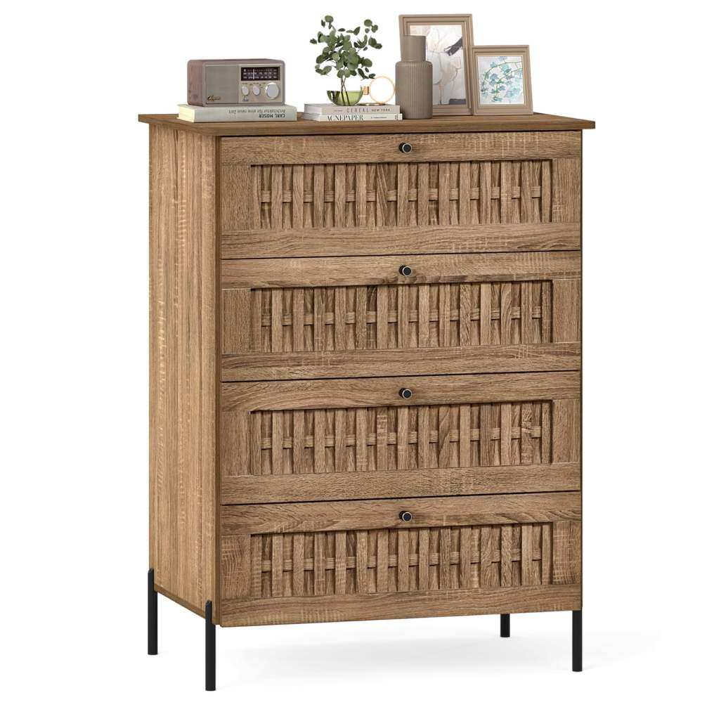 ● Nature-Inspired Style: Crafted with a wood grain finish and drawer fronts adorned with rattan texture, this storage chest exudes modern natural aesthetic. The combination of warm wood tones and woven details enhances living room, bedroom, or hallway.