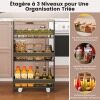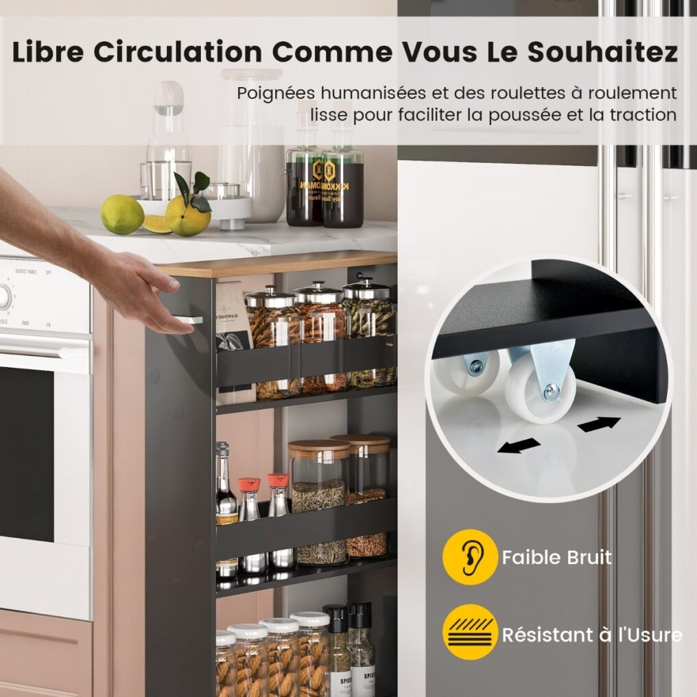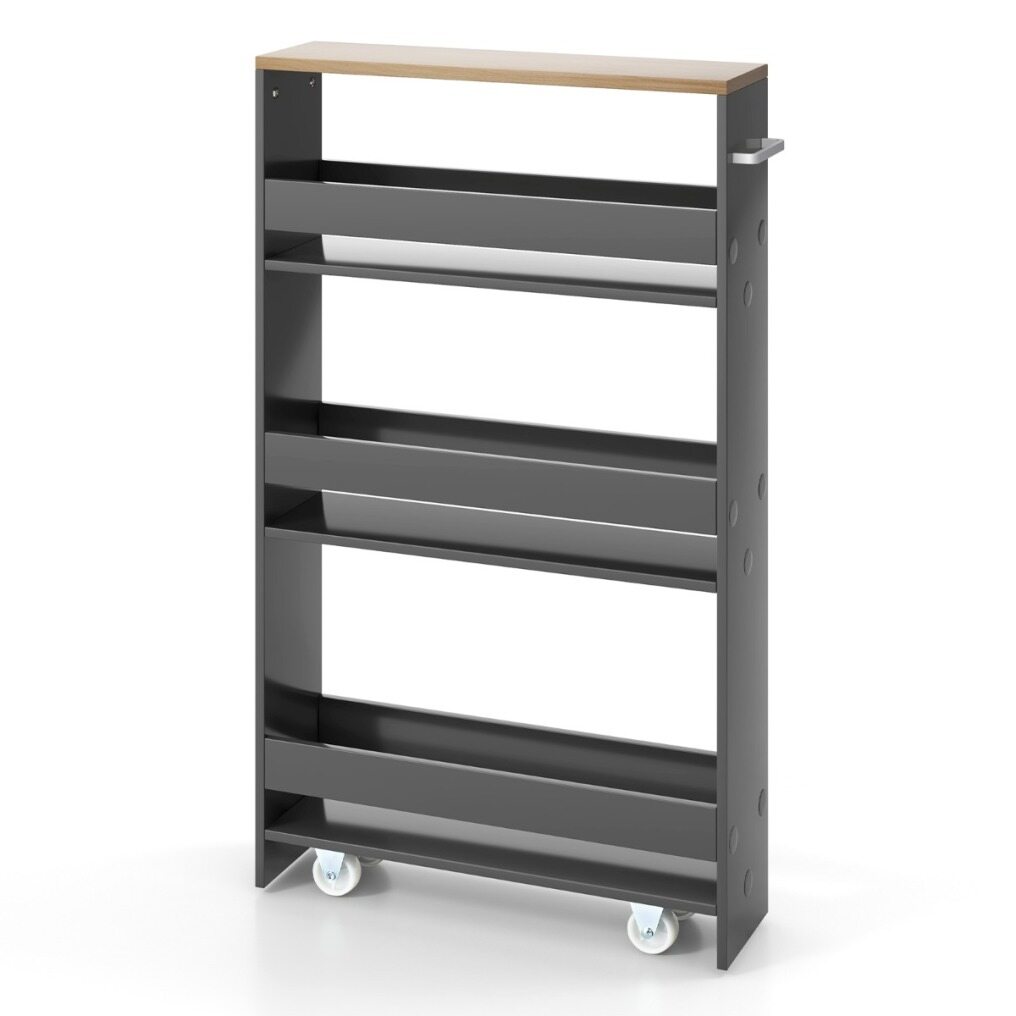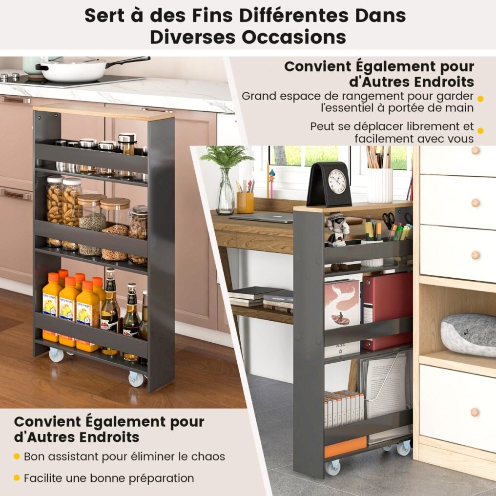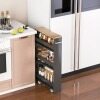 Our multifunctional kitchen rolling cart is a good helper for your daily necessities organization. Featuring a 3-tier open shelf and an additional top, this storage cart has space for spice jars, drink bottles, and more. And the sturdy wooden construction makes it strong enough to carry a variety of utensils and appliances. Thanks to the compact frame and convenient handle, you can push it into corners or through tight spots to save space. Plus, the noiseless universal casters ensure smooth rolling on any floor. This modern kitchen cart is perfect for the bathroom, laundry room, kitchen, and tighter places.