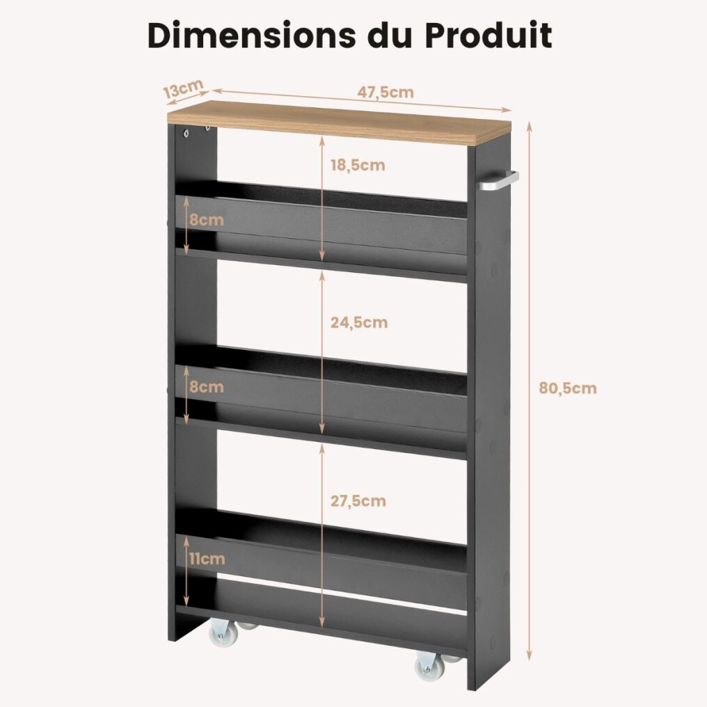 Space-saving design for versatile use : The slim storage rack measures 48 x 12.5 x 81 cm, making it suitable for narrow, limited spaces. With a modern style and exquisite appearance, it matches various home decorations. You can store it in a corner, whether in the kitchen, living room, bathroom, laundry room or other places.