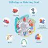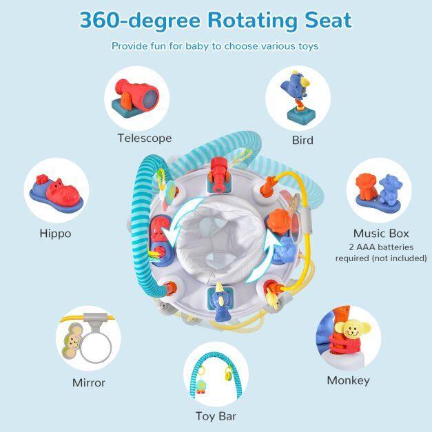 Activity Table and Various Toys: Easily, the activity center can be converted into an S-shaped activity table. Plus, we also offer plenty of toys, like telescopes, hippos, mirrors and more, to delight kids, while simulating their imagination. More surprisingly, a music box is included, which needs 2 AAA batteries (not included).