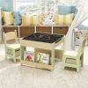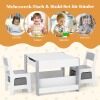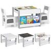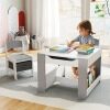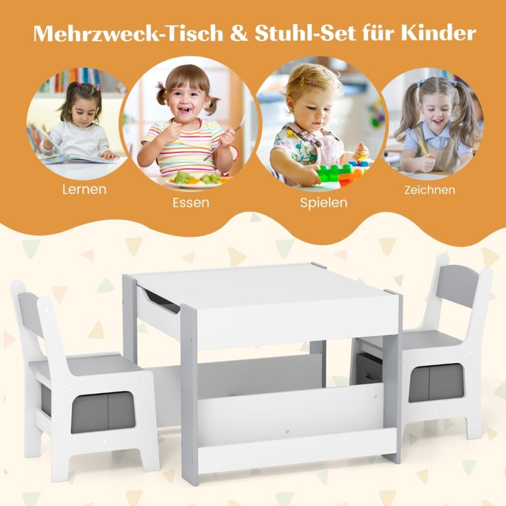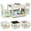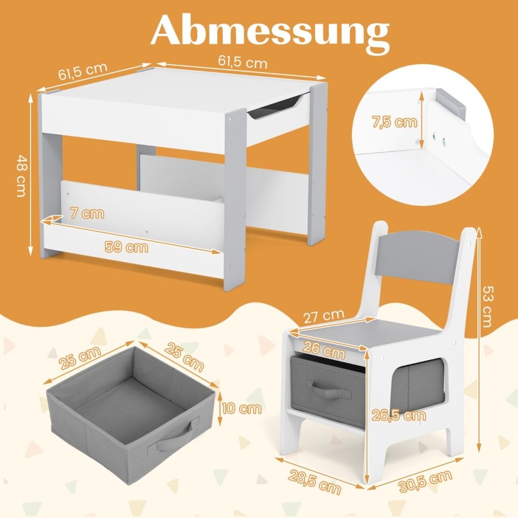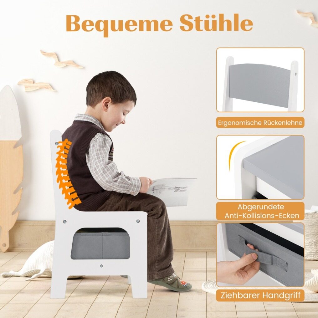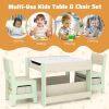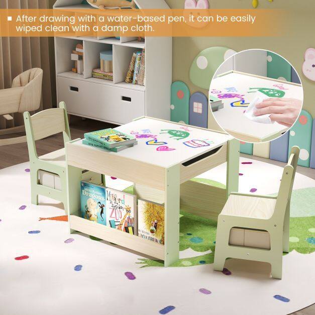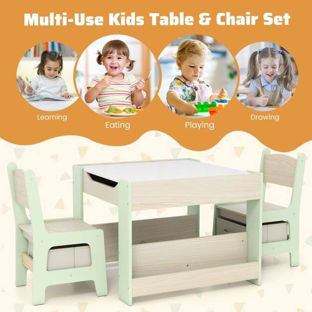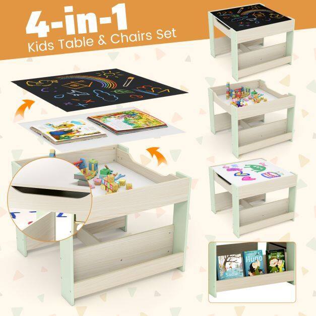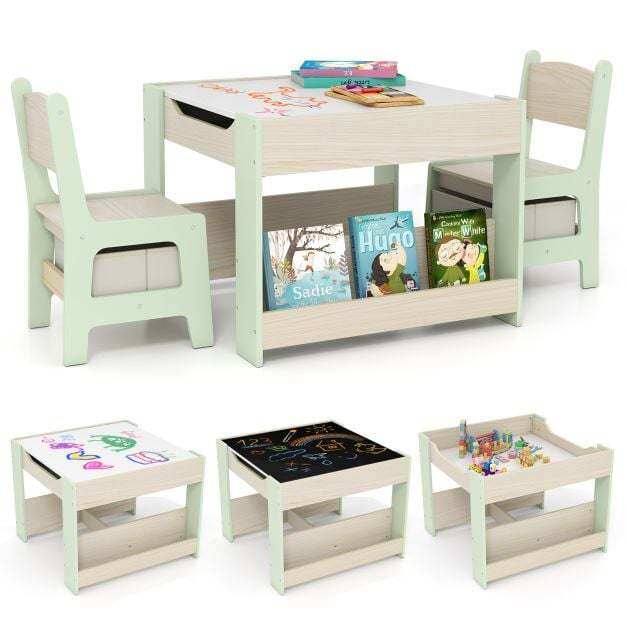 Versatile 4-in-1 Design: This kids table and chairs set has a detachable and reversible tabletop and various storage options. One side of the tabletop boasts a blackboard for drawing and creativity, while the other offers a smooth surface ideal for reading, eating, or crafting activities.