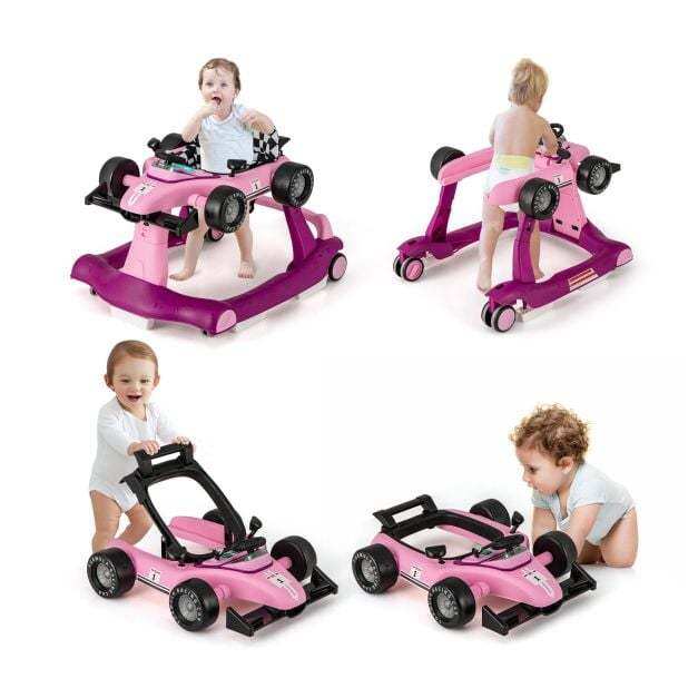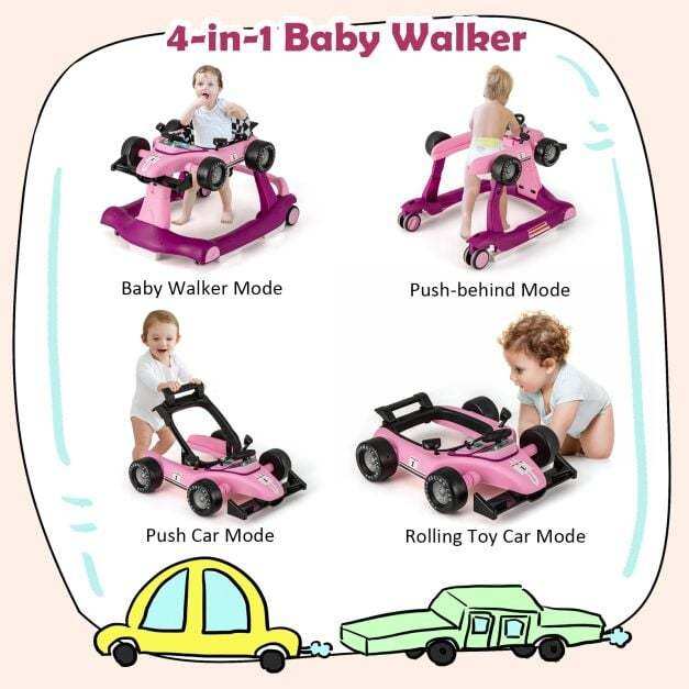 This 4-in-1 baby walker allows your little one to learn walking with more fun! With the simulated racing car shape, the baby walker will be more attractive to kids than others. And the appealing sound and light effect offers more fun to your little one. More importantly, the 4-in-1 versatile design with adjustable height and speed enables the walker to grow with your baby. This baby walker is also quite safe to use, as it's designed with anti-slip base and safety bumper. Furthermore, with quick-folding design, the walker won't take up too much space for storage. All in all, this car-like baby walker will do a good job in helping baby learn to walk.