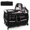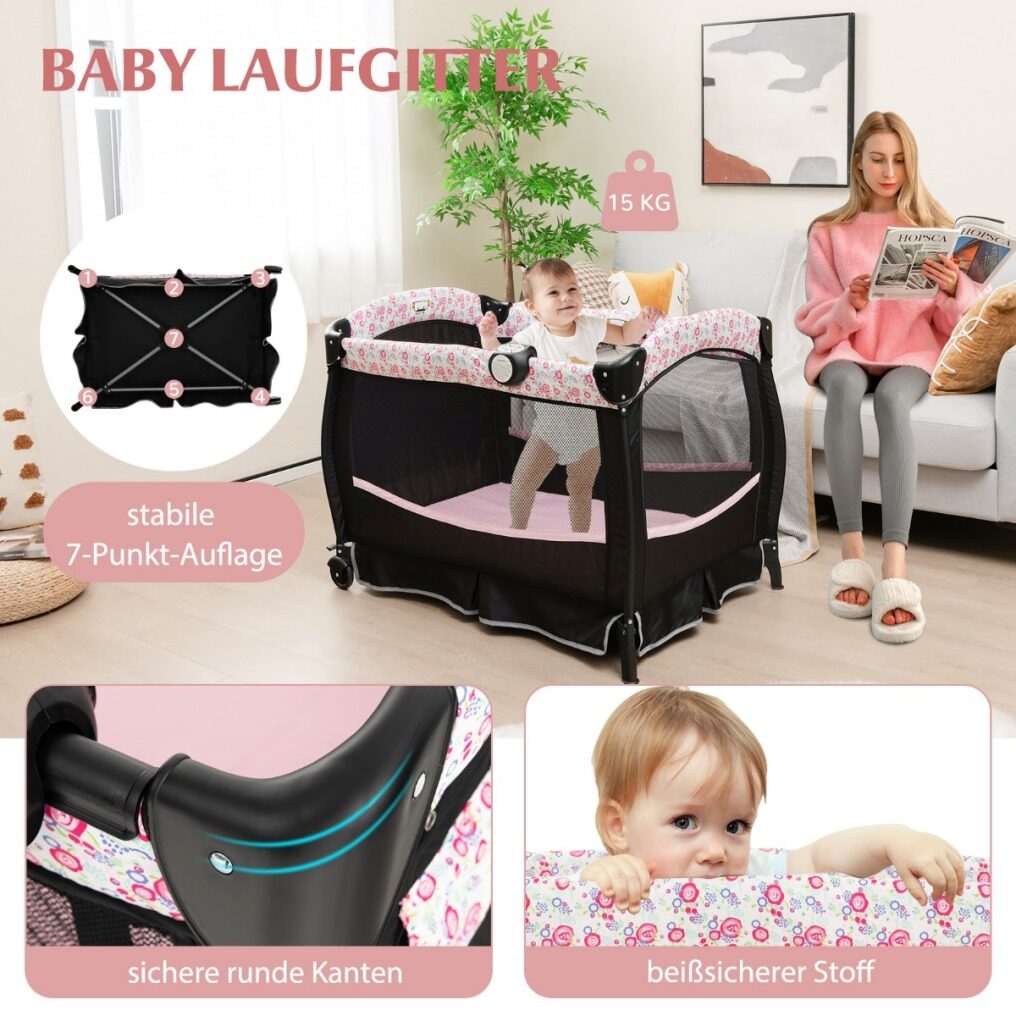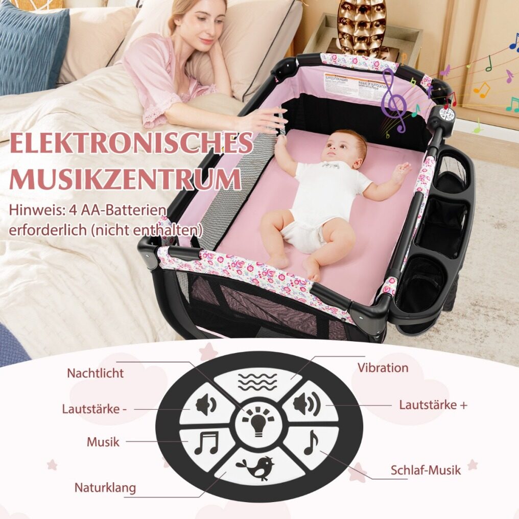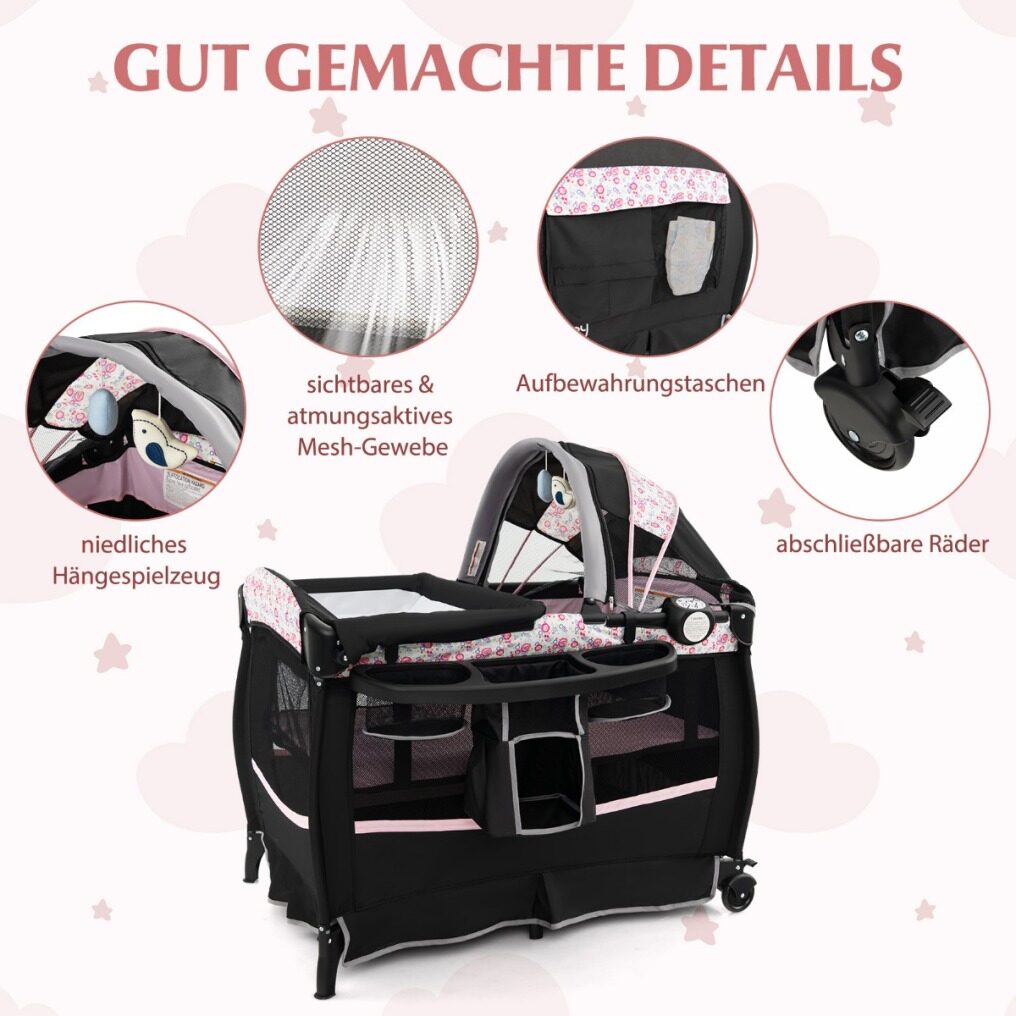 This pack and play can be used as an infant bassinet (with a weight capacity of 9 kg), baby bed, changing table (with a weight capacity of 9 kg) and baby play area (with a weight capacity of 15 kg). Equipped with a bassinet, mattress and changing table, this versatile baby play bed ensures your baby's comfort and makes parenting easy. Assembly is easy without tools: place the bed vertically, open the short armrests of the bed, open the long armrests of the bed, press down the bottom. A carrying bag is included for travel or storage. The music box and cute hanging toys provide a fun and comfortable space for your baby. The 7-point steel frame ensures great stability, and the harmless fabric is safe for biting.