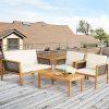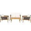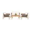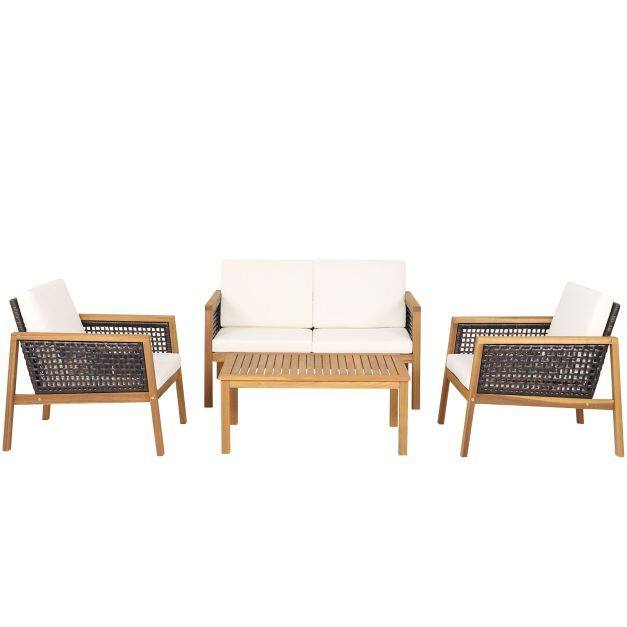 Various combinations for this outdoor sofa set allow you to rearrange based on the size of your space freely. Therefore, it is suitable for the courtyard and will fit for other outdoor places. Considering the changing weather, this patio furniture set is constructed of solid acacia wood and all-weather PE rattan. To extend the wooden furniture’s service time, please do not put it outdoors when it rains. What’s more, the loveseat and chairs are equipped with soft padded cushions and ergonomic armrests for a comfy sitting experience. And the large coffee table accommodates different items easily. If you are looking for an outdoor sofa set like this, do not hesitate to place an order!