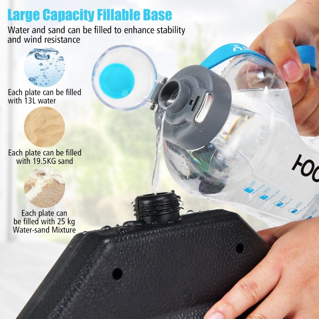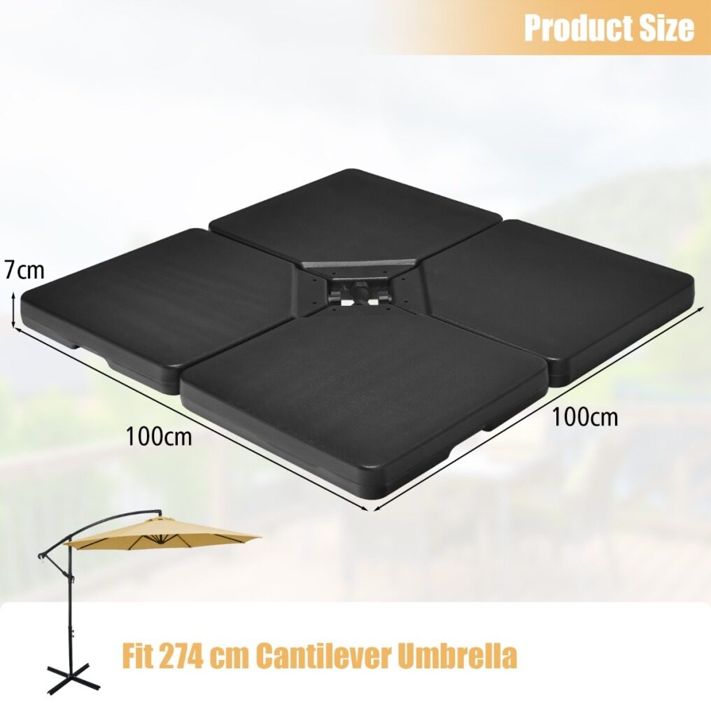 ● Large Filling Capacity: Each plate can be filled with 3.4 gal water or 5.2 gal sand to add weight of the base. Therefore, the heavy duty base can provide powerful support for your cantilever offset umbrella in windy conditions.
