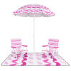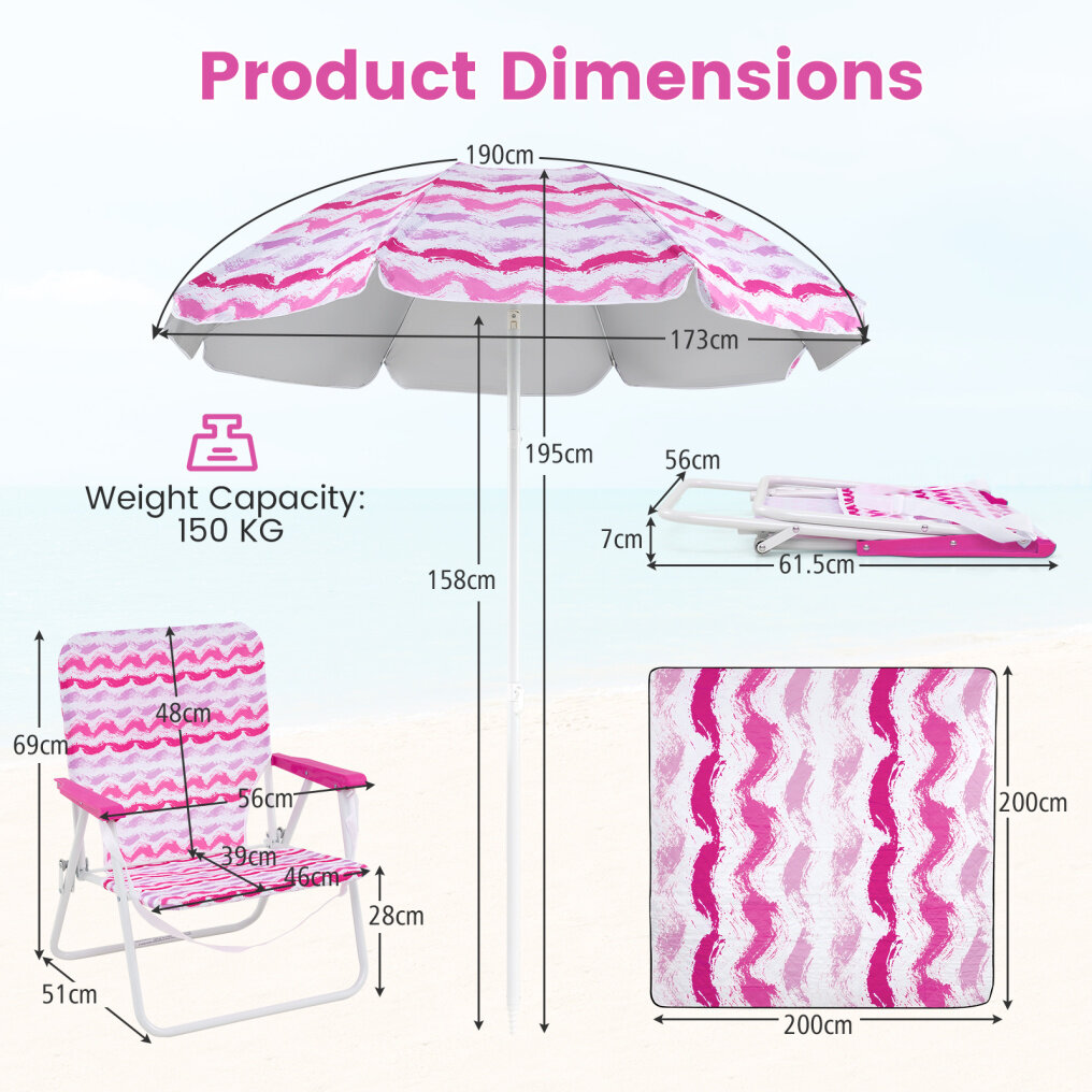 Complete 4 Pieces Beach Set: This comprehensive set features a 195 cm beach umbrella, 2 folding chairs measuring 56 x 51 x 69 cm(L x W x H), and a large 200 x 200 cm beach blanket, configurable in multiple layouts that suit any family outing or social gathering.