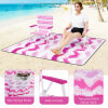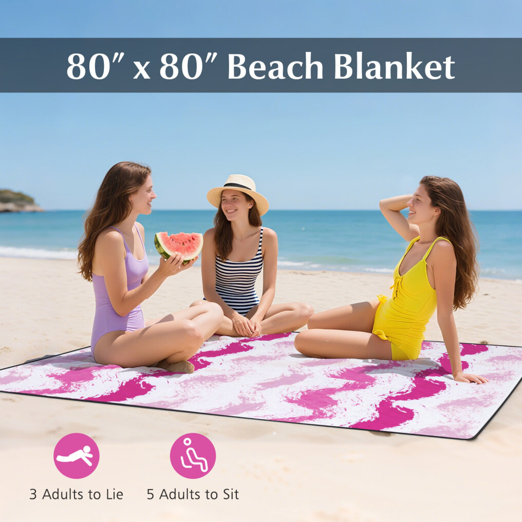 Waterproof Beach Blanket: The beach mat features 3-layer reliable construction, including polyester fabric, soft cotton and aluminum film. Hence, the beach mat is not only waterproof and wear-resistant but also comfortable for extended use on both the beach and grass. It is also washable for hassle-free upkeep.
