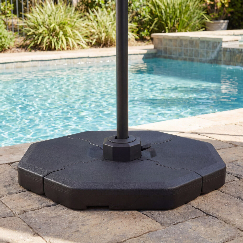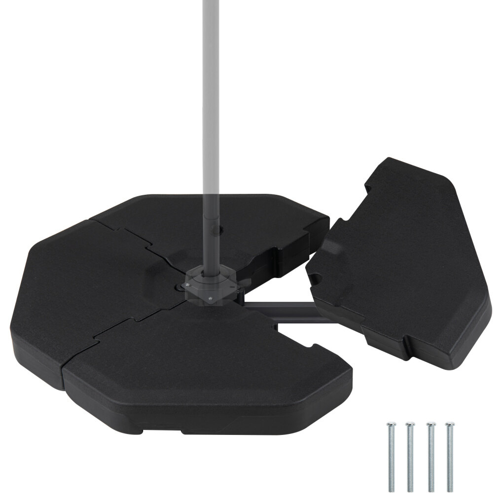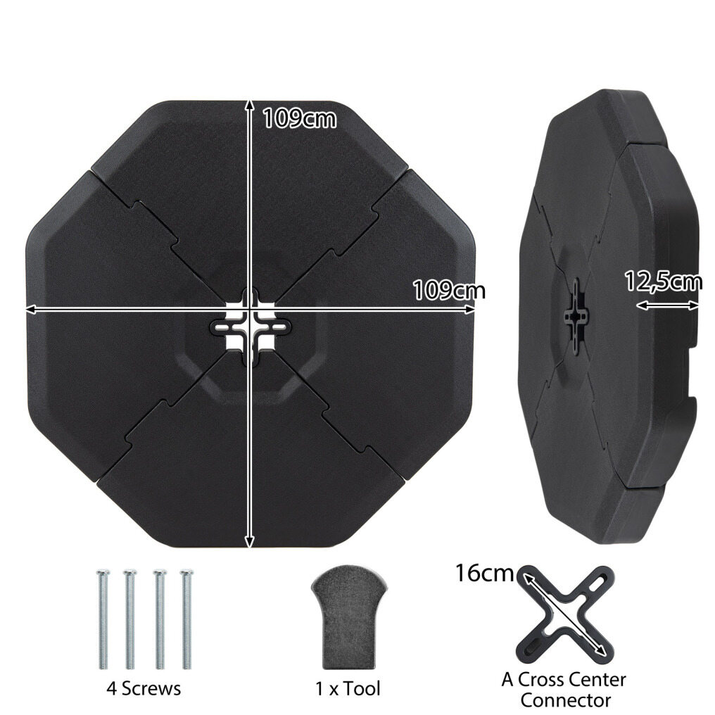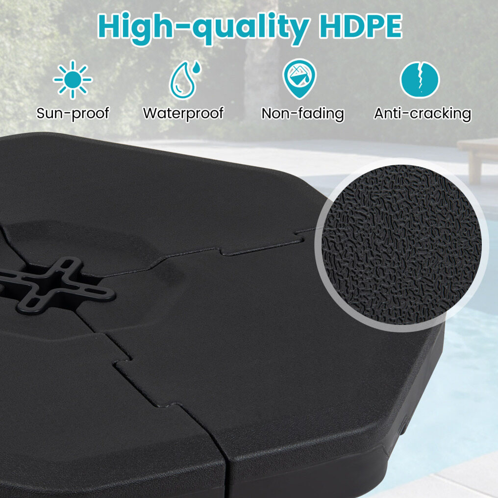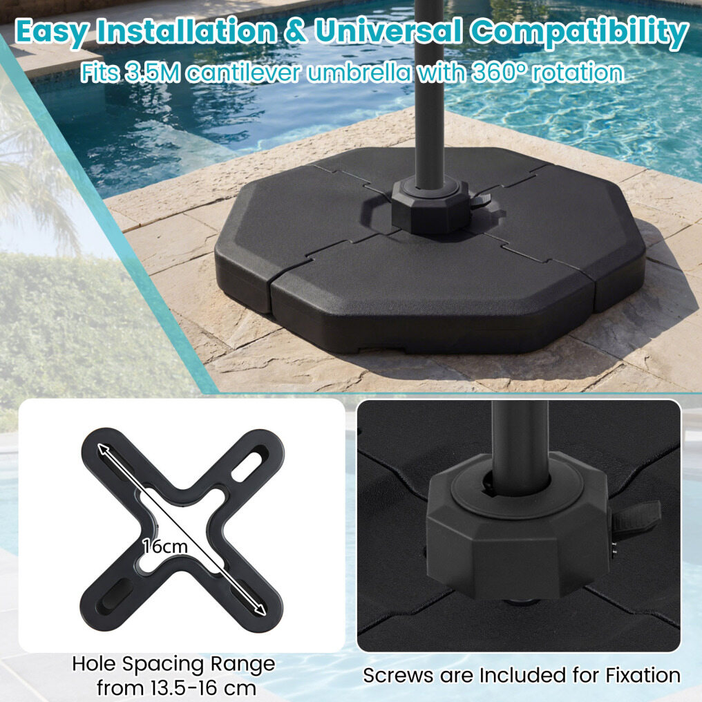 Featuring 4 fillable reservoirs, this cantilever patio umbrella base weight system offers serious counterbalance. Each offset patio umbrella base plate can be filled up to 48 kg water and sand mixture to build the mass needed for better wind resistance. Constructed from sun-proof HDPE, the offset patio umbrella base resists cracking and fading for great durability. A secure center connector allows the offset patio umbrella base to attach firmly to many cantilever stands using 13.5-16 cm compatible hole spacing and the included hardware, helping keep the cantilever patio umbrella and base properly aligned. Built-in carry handles and stackable plates make it easier to move and store the cantilever patio umbrella and base weights, while the sealed fill ports support quick filling and draining with reduced leaking. Note: The cantilever umbrella base is not included.