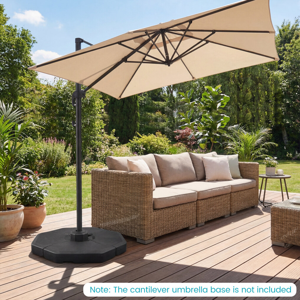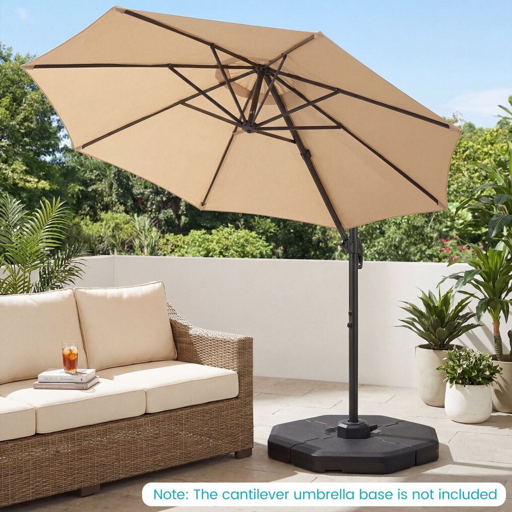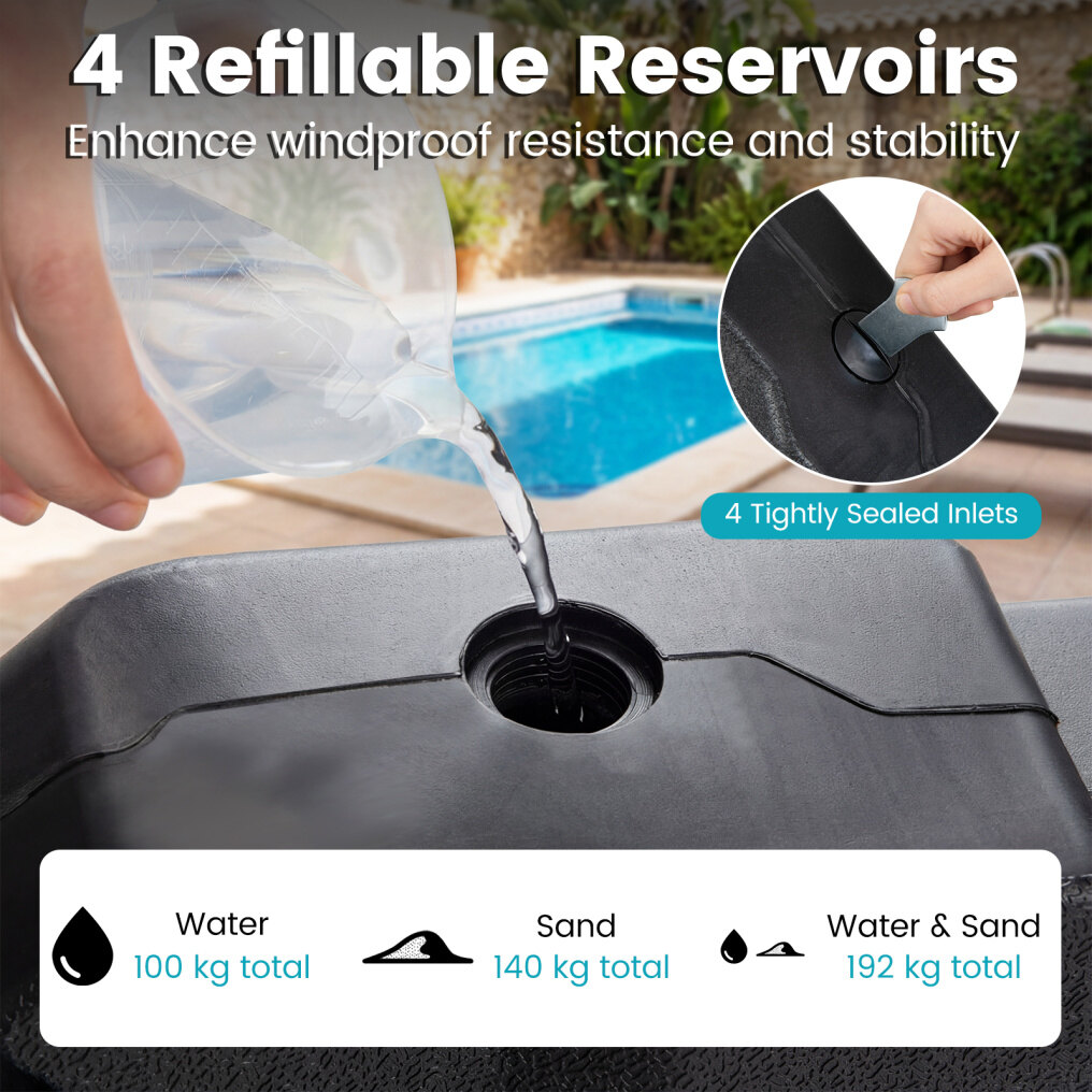 High Capacity Fillable Reservoirs: The 4 pieces offset umbrella base includes 4 large fillable reservoirs that hold water, sand, or a mixed combination. Together they reach an impressive total capacity of up to 192 kg, helping your offset hanging umbrella remain steady during backyard gatherings or relaxing poolside afternoons.