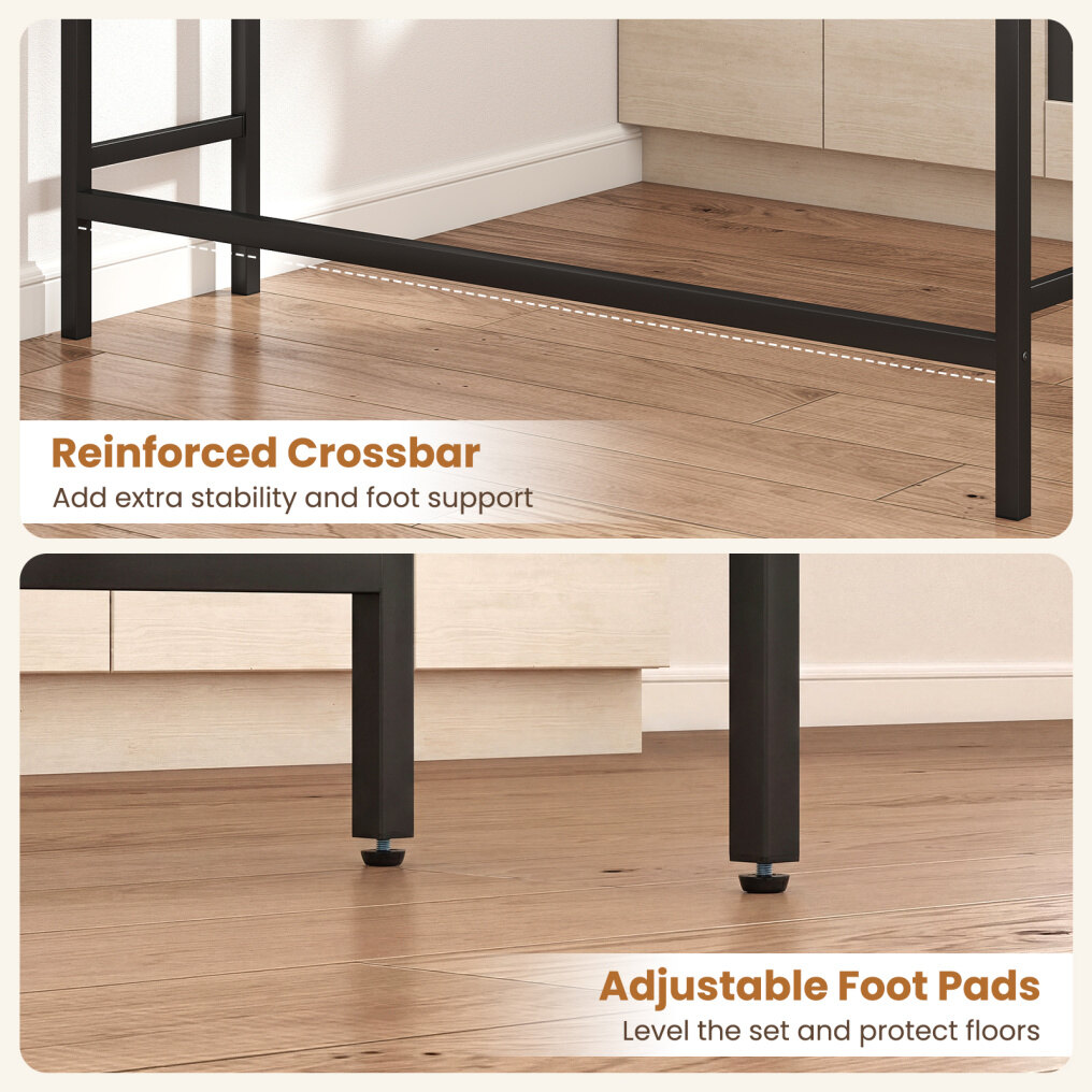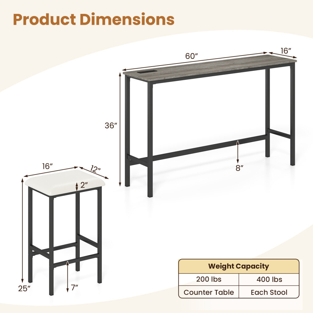 ● Long Surface, Strong Support: With 60" long tabletop, this bar table set offers room for dining and laptops. Moreover, the heavy-duty metal frame supports daily use. The table holds 200 lbs, each stool holds 400 lbs and adjustable foot pads help level.