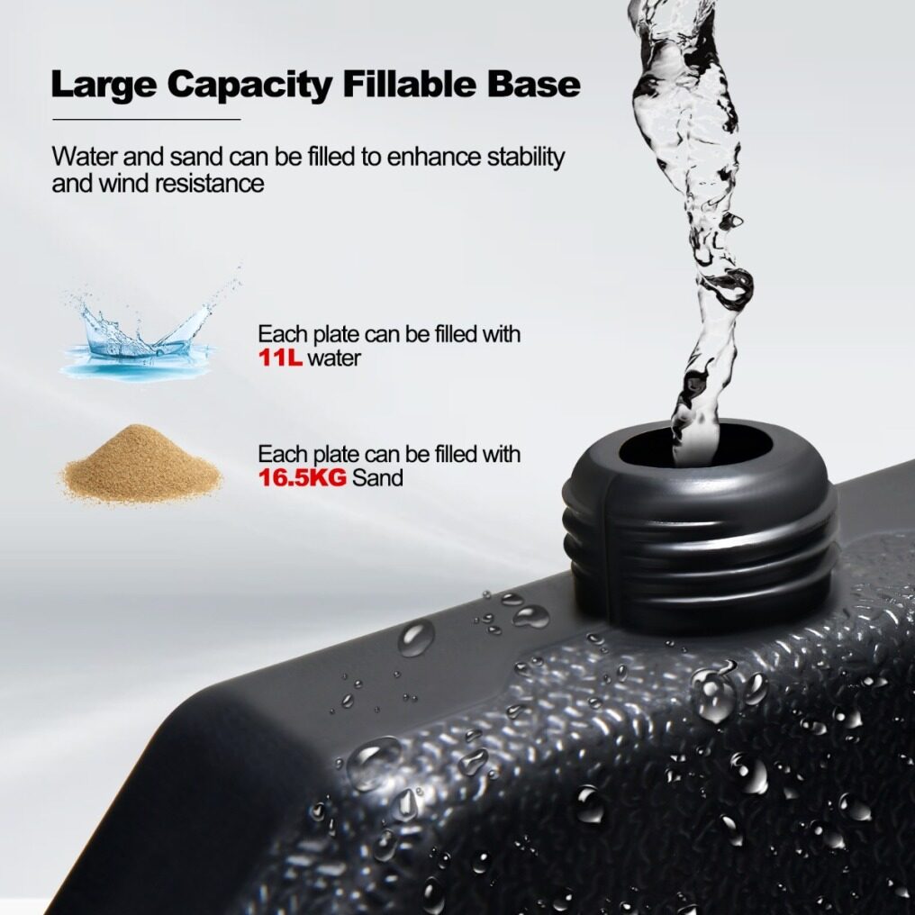 ● Fillable Heavy Base: Each plate can be filled with 3 gal water or 4.4 gal sand to add weight of the base to add the weight of base. Therefore, this offset umbrella base will offer strong support for your offset hanging umbrella to resist wind--resistance.