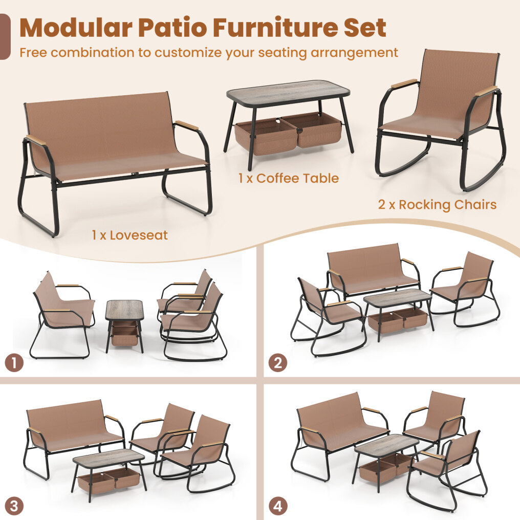 ● Versatile Layout Options: Including 1 coffee table, 1 loveseat and 2 patio rockers, this outdoor conversation bistro set allows you to arrange them in various configurations to suit your porch, balcony or garden. Please avoid rain exposure for prolonged service life.