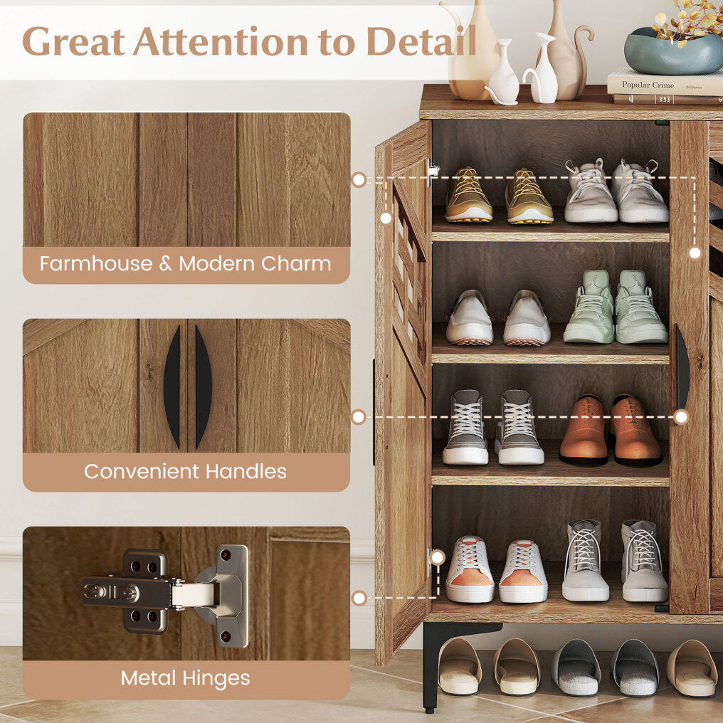 ● Great Attention to Detail: Prioritizing your convenience, the shoe cabinet features easy-grip handles and metal hinges for smooth door opening and closing. Additionally, the multiple air vents promise a better storage environment.