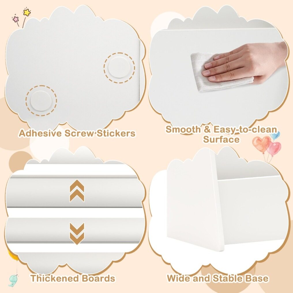 More Safe and Child-friendly Design: Rounded and splinter-free edges protect kid’s delicate skin from getting scratched. Smooth & easy-to-clean surface makes cleaning a breeze. Additionally, it complies with ASTM/CPSIA for high safety and reliability. And the screw hole stickers offer the kids bookshelf a decent look.