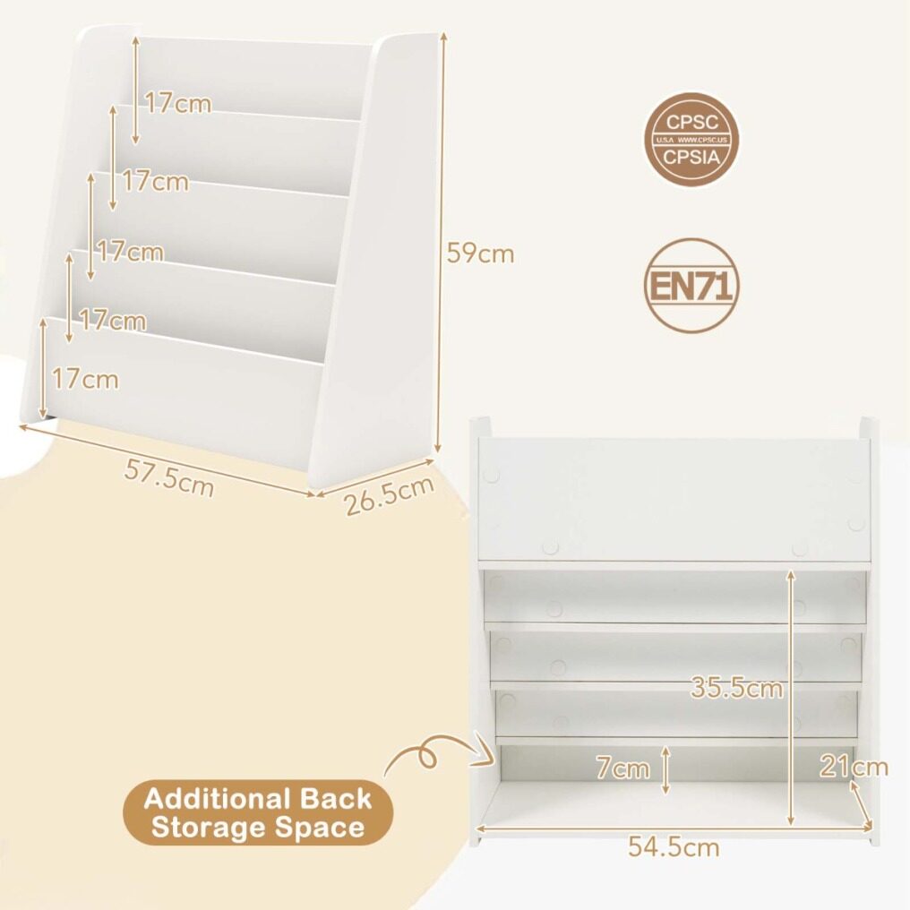 59cm Optimal Height and Open Design: The 23 inches optimal height keeps all the books accessible. Moreover, the front-facing open design allows kids to easily select, store or take out their favourite books, which helps to cultivate reading habits.