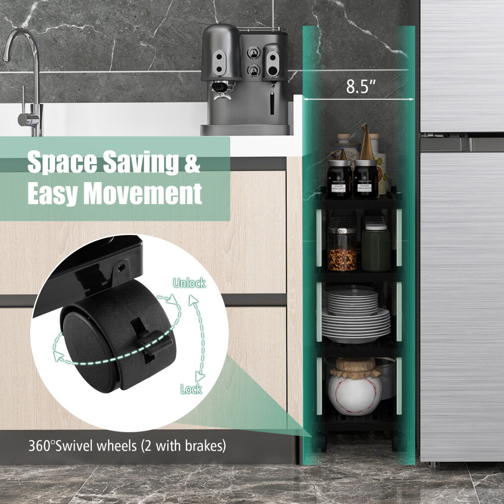 ● Space Saving Design: This slim storage cart helps you maximize your home storage and organization, providing four layers of shelving in a compact design. With dimensions of 16" x 8.5" x 23.5" (L x W x H), it efficiently fits in limited spaces.