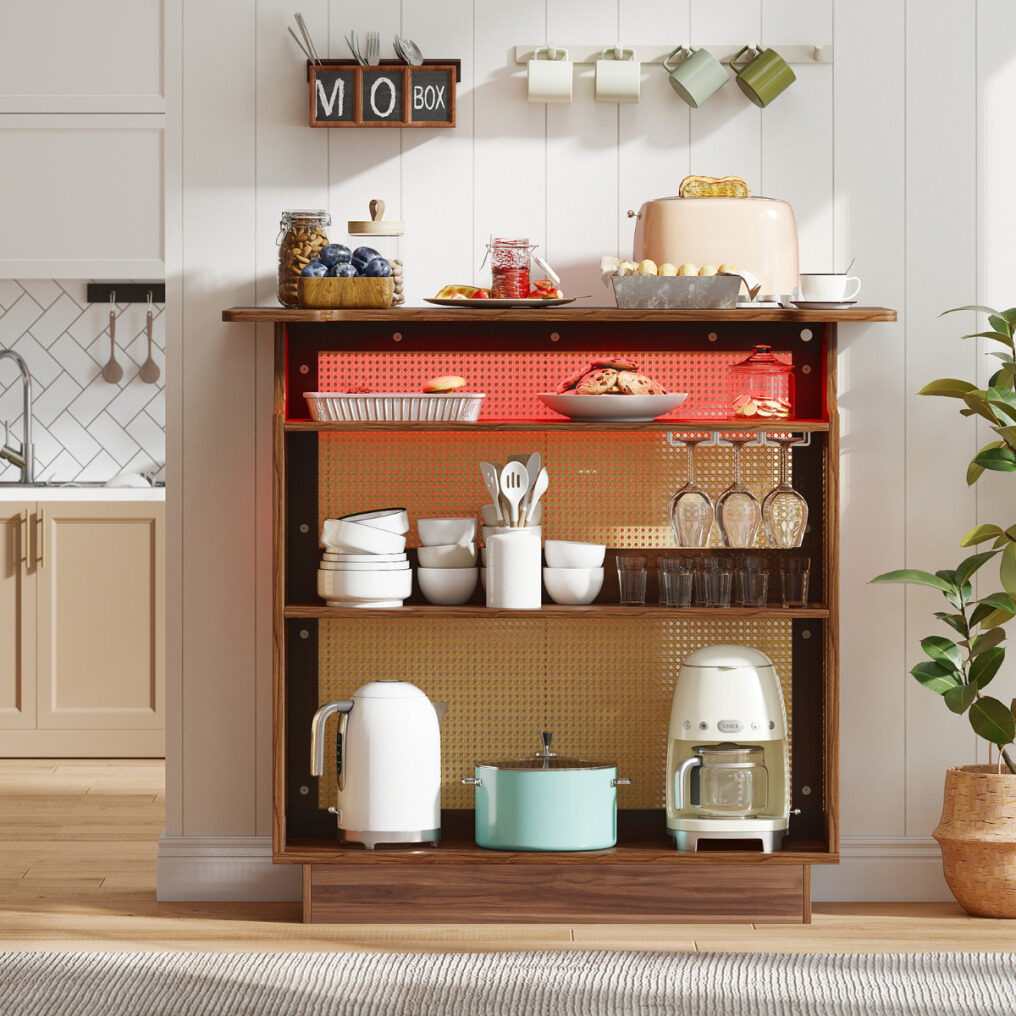 Sturdy and Secure Build: Constructed from robust MDF, this bar cabinet is built for long-lasting durability. For added safety, it comes with 2 types of anti-tip kits: 2 anti-tip straps and 2 L-shaped brackets for secure placement and safe household use.