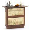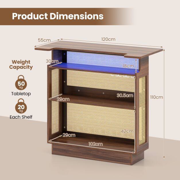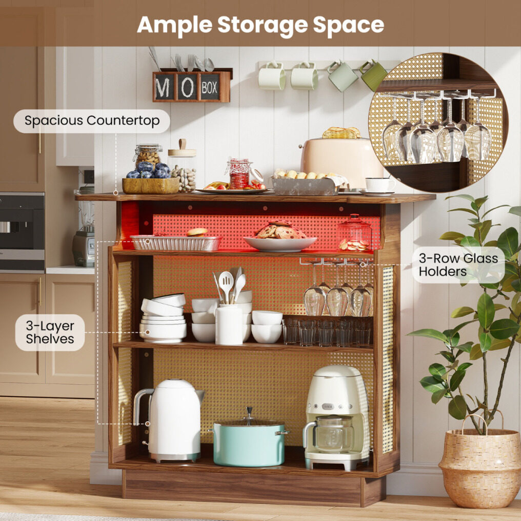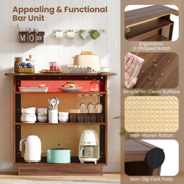 The appealing and functional bar unit features a dynamic light strip, controllable via remote or app, offering 60,000 RGB colors and music sync. The tabletop includes a U-shaped cutout for comfortable seating. Moreover, the spacious storage space makes your bar area well-organized, while the 3-row stemware racks hold up to 9 wine glasses. This versatile rattan bar unit is the perfect blend of functionality and farmhouse elegance for your kitchen, living room, or pub.