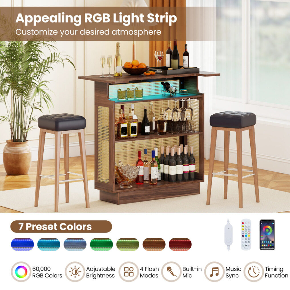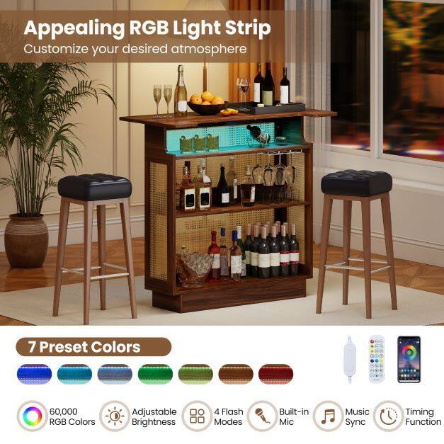 Versatile RGB Lighting: This mini home bar features an appealing RGB light strip that offers simple control via on/off switch, remote, or app. Choose from 7 preset colors or a vast spectrum of 60,000 options. The lighting system also boasts adjustable brightness, 4 flash modes, built-in mic, music sync and timing function.