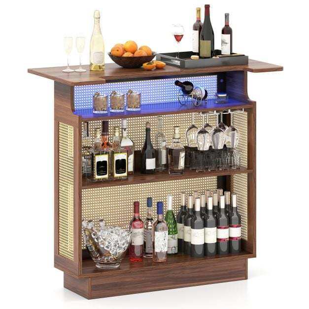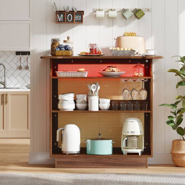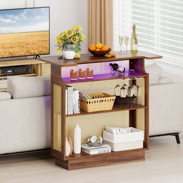 Charming Farmhouse Aesthetic: Enhance your home with the charming farmhouse style of the bar unit, which combines well-woven rattan with natural wood grain finish. This elegant design makes it a versatile piece for kitchen, living room, or pub.