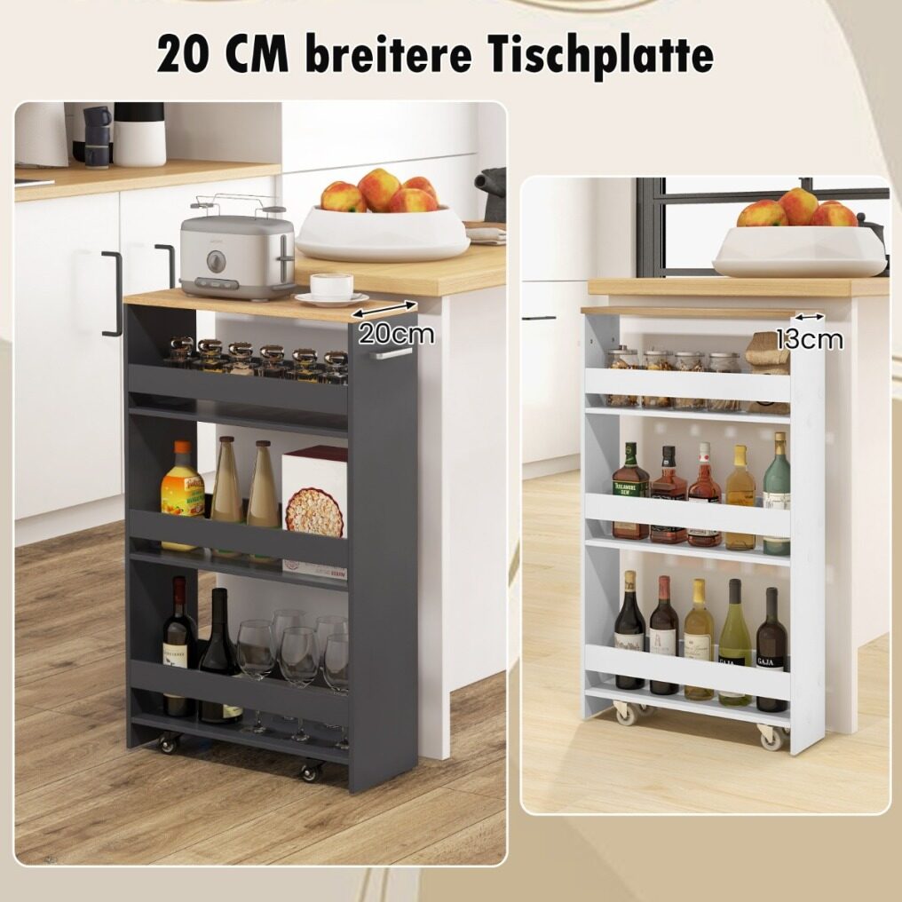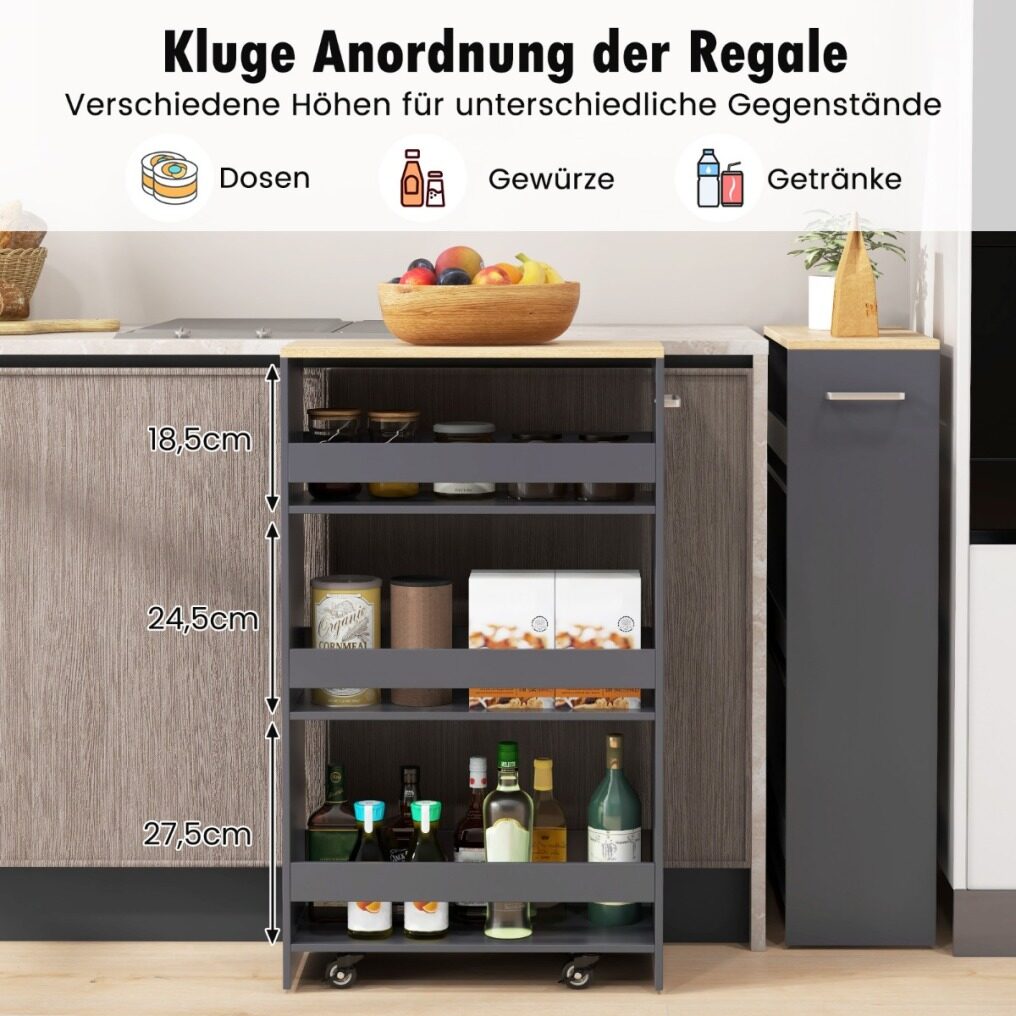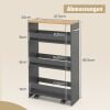 Maximize your space with our slim storage cart! With a smart shelf layout and guardrails to prevent spills, the versatile cart is a perfect solution for various needs. Mounted on 360° swivel casters, 2 of which are lockable, the kitchen cart can be easily moved from room to room. Crafted from durable engineered wood, this cart offers reliable construction that can withstand daily use. Practical and stylish, this versatile cart is a must-have addition to any room in your home!