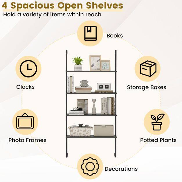 Space-Saving Wall Organizer: This wall-mounted ladder shelf maximizes vertical wall space effectively, offering a space-saving storage solution. Moreover, 4 wall mounting screws are included for fixation.