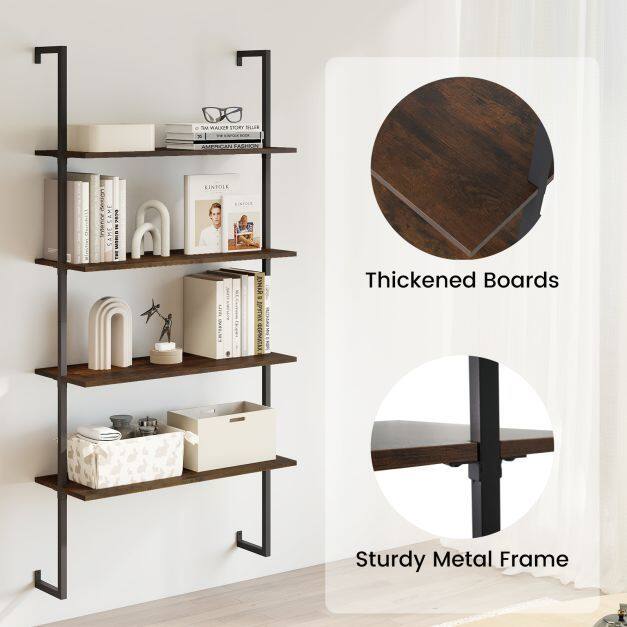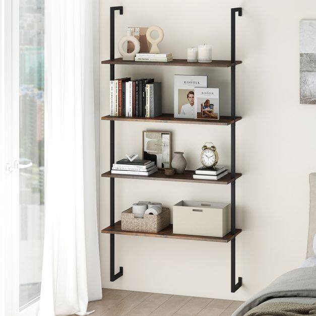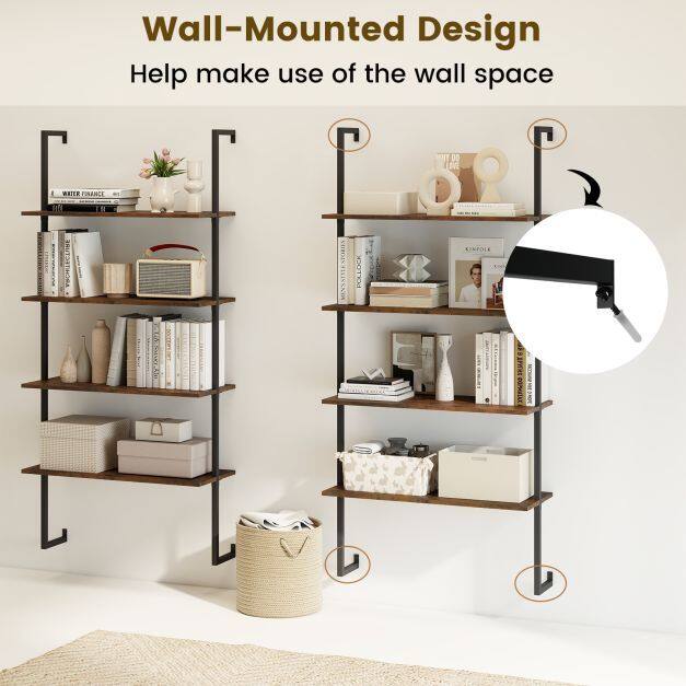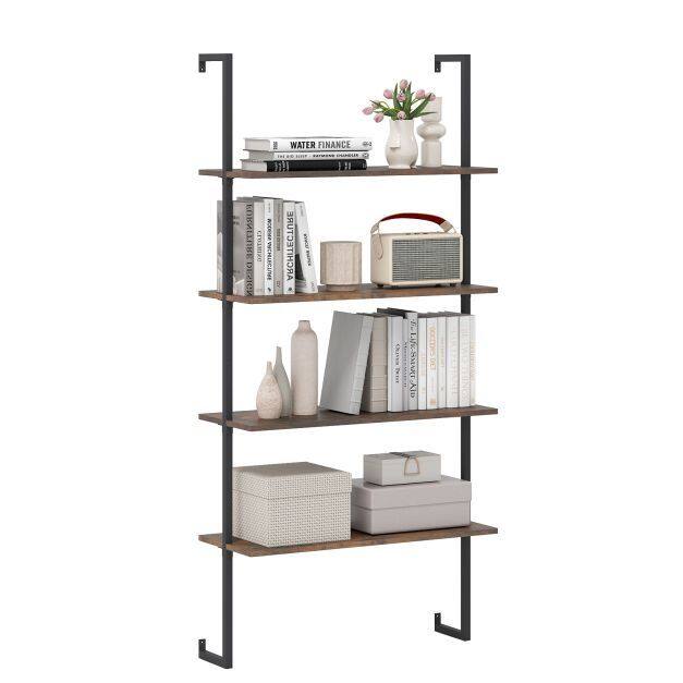 This ladder shelf features optimal use of vertical wall space and provides a neat and steady storage solution for books, plants, and ornaments. The robust metal pipes offer strong support and long-lasting use. And wood texture of the shelves bring more elegance. This floating pipe shelf is an exquisite addition to any room, enhancing the decoration while keeping things organized and accessible. Enjoy a touch of sophistication and efficiency to your living area or workspace with this functional wall organizer.