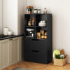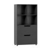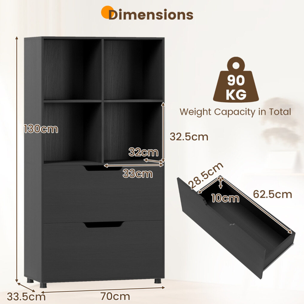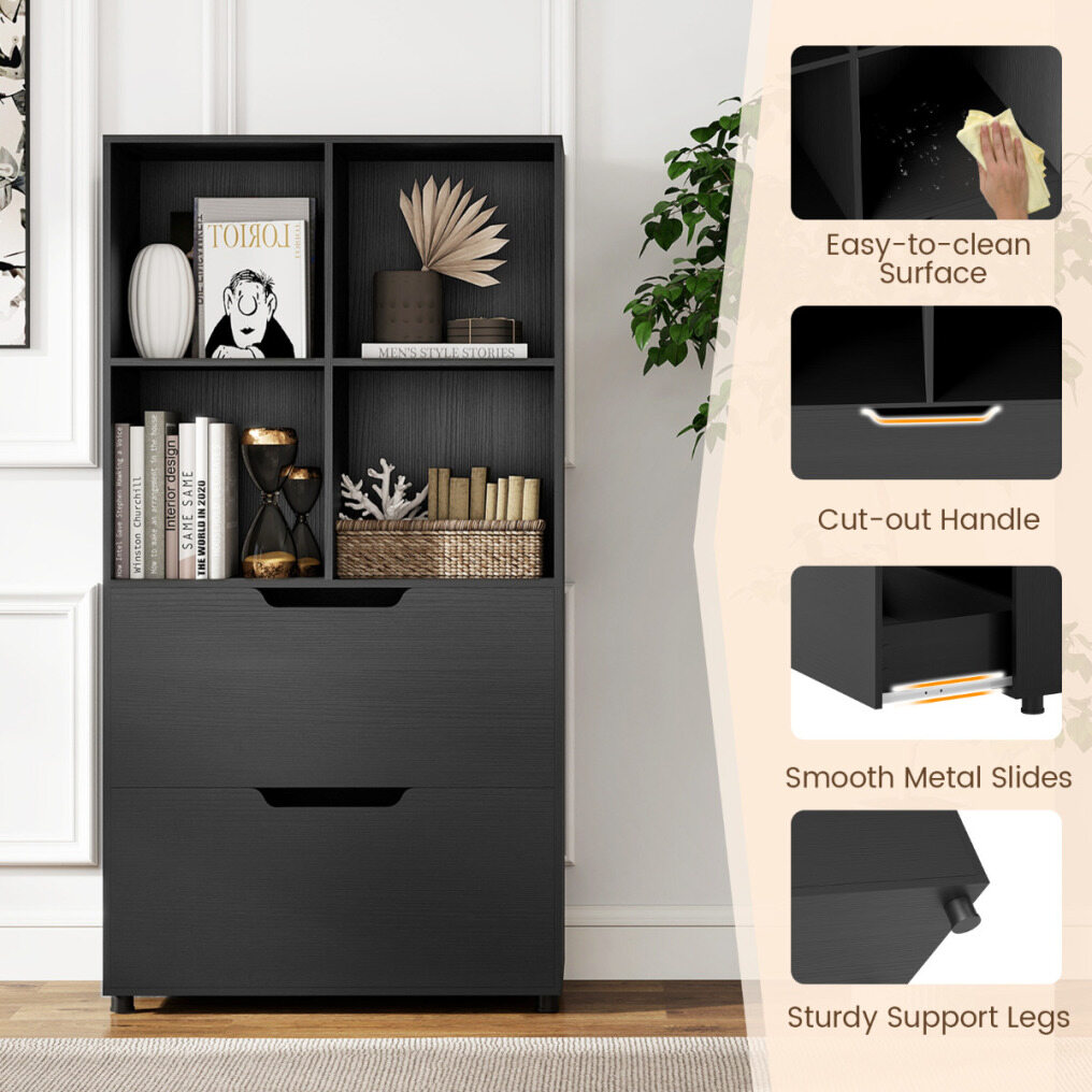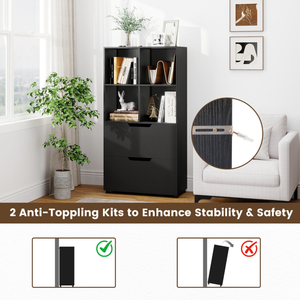 With four open compartments and two large drawers, this freestanding bookcase is perfect for organizing books, decorative items, and essential supplies in your home. The display shelf is equipped with two anti-tip devices for added safety. Sturdy support legs provide additional stability, preventing the shelf from tipping over. This versatile bookcase combines modern design with functionality and is an ideal addition to various rooms.