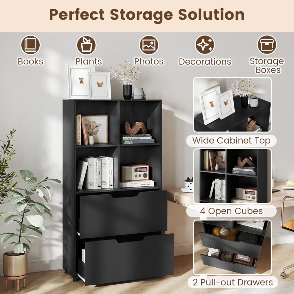 Proportionate layout: This bookcase features four open cubes and a wide top, providing ample space for books, collectibles, or decorative items. Beneath these cubes, two pull-out drawers offer hidden storage to help keep your living space tidy.