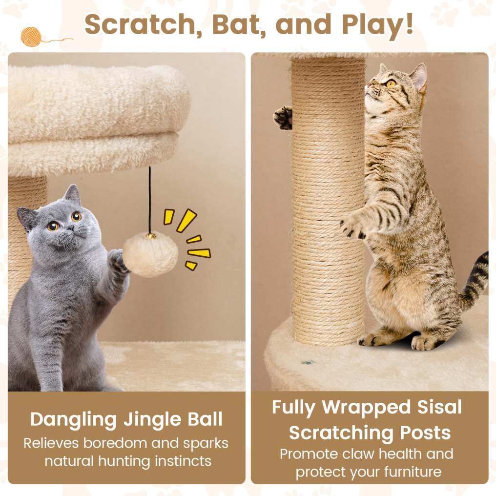 【Stable and Space-Saving Design】With a sturdy 58.5 x 58.5 cm base, the cat tree ensures optimal stability, preventing tipping or wobbling. The compact multi-story layout maximizes space and fits easily into corners without taking up too much floor space.