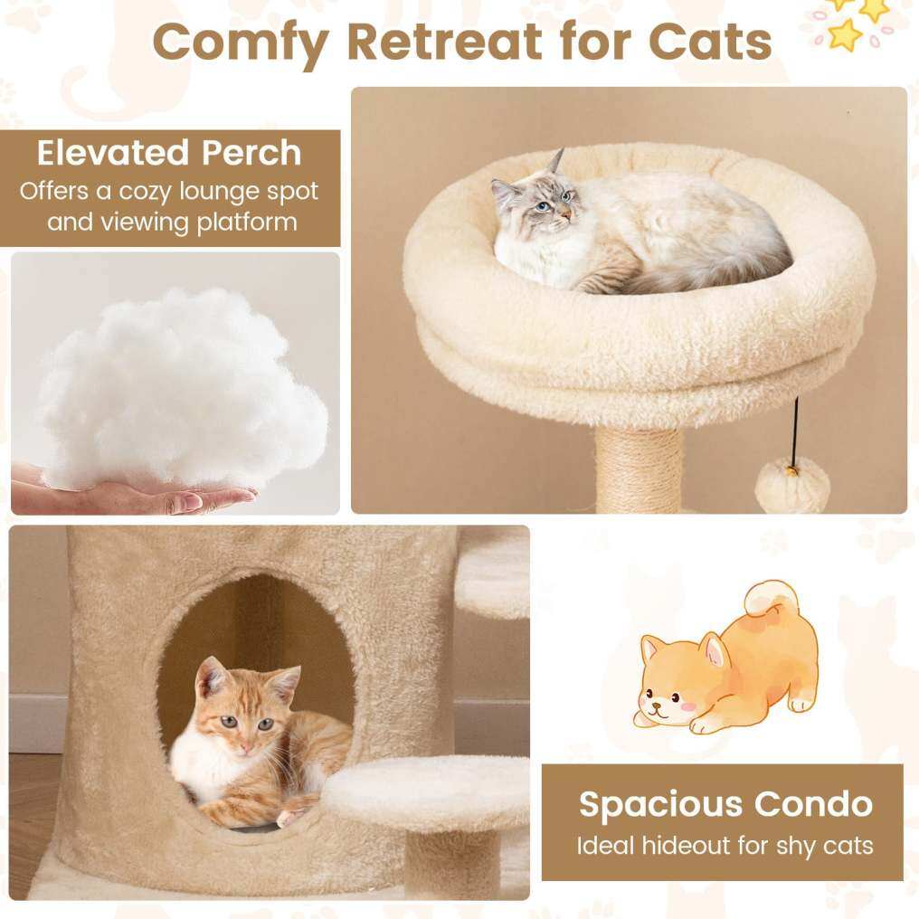 【Comfortable Cat Hideaway】Equipped with a padded top perch, the cat tower provides a cozy lounging space with a high view. The raised edges filled with soft fiber provide optimal comfort for your pets. In addition, the large condo provides a secluded corner for a stress-free nap.