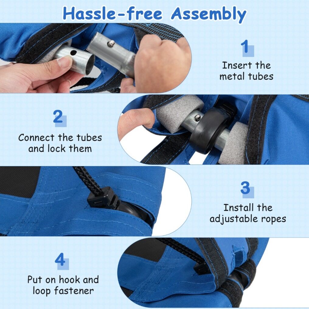 Hassle-free Assembly: Thanks to its simple structure and clear user manual, you can effortlessly finish assembly in a few minutes. What you need to do is to insert the metal tubes, connect the tubes and lock them, install the adjustable ropes as well as put on hook and loop fastener.